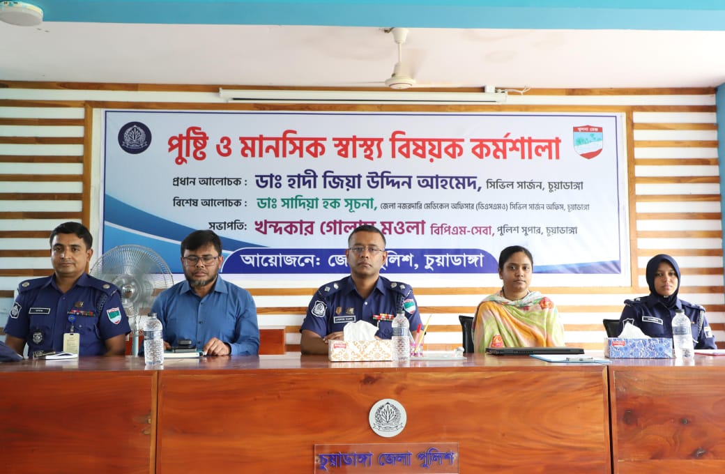 নিজস্ব প্রতিবেদকঃ চুয়াডাঙ্গা জেলা পুলিশের উদ্যোগে আজ দুপুর ১টায় চুয়াডাঙ্গা পুলিশ লাইন্স ড্রিলশেডে অনুষ্ঠিত হলো “পুষ্টি ও মানসিক স্বাস্থ্য বিষয়ক কর্মশালা”। পুলিশ সদস্যদের সঠিক খাদ্যাভ্যাস, পুষ্টির গুরুত্ব ও মানসিক সুস্থতার প্রতি সচেতনতা বৃদ্ধির লক্ষ্যে আয়োজিত এ কর্মশালায় সভাপতিত্ব করেন পুলিশ সুপার খন্দকার গোলাম মওলা, বিপিএম-সেবা।