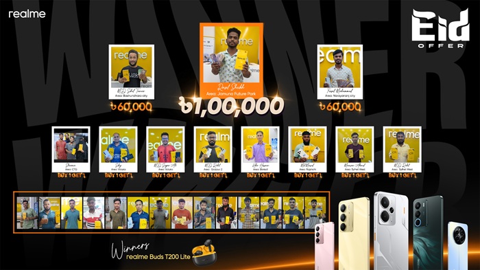 একইসাথে, আকর্ষণীয় এই ক্যাম্পেইন উপলক্ষে চট্টগ্রাম, ময়মনসিংহ, গাজীপুর, বরিশাল, রাজশাহী ও সিলেট থেকে আটজন বিজয়ী জিতে নেন ফ্রি স্মার্টফোন। এছাড়াও, দেশের বিভিন্ন স্থান থেকে আরও ১৪ জন বিজয়ী জিতে নেন রিয়েলমি বাডস টি২০০ লাইট।
