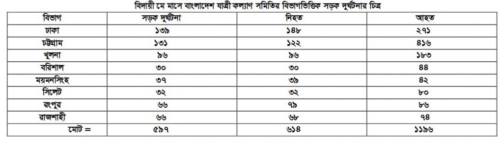 বাংলাদেশ যাত্রী কল্যাণ সমিতির পর্যবেক্ষণ মতে, মে মাসে সড়ক দুর্ঘটনার উল্লেখযোগ্য কারণসমূহ :