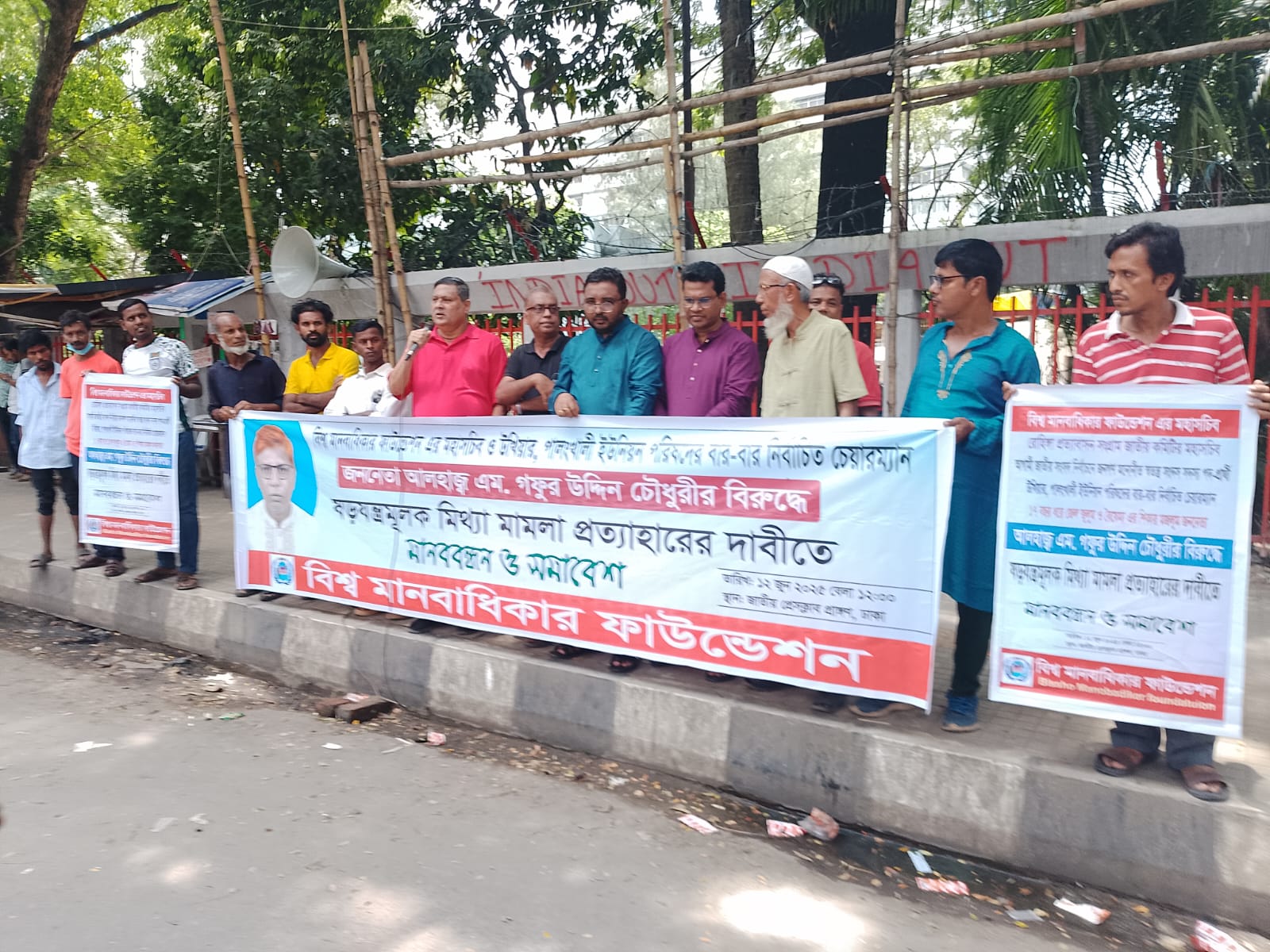 নিজস্ব প্রতিবেদকঃ বিশ্ব মানবাধিকার ফাউন্ডেশন ও রোহিঙ্গা প্রত্যাবাসন সংগ্রাম জাতীয় কমিটির মহাসচিব কক্সবাজার এর উখিয়া উপজেলার পালংখালী ইউনিয়ন পরিষদের বার-বার নির্বাচিত চেয়ারম্যান আগামী জাতীয় সংসদ নির্বাচনে সাধারণ জনগন কর্তৃক মনোনীত জাতীয় সংসদ সদস্য পদপ্রার্থী মজলুম জননেতা এম গফুর উদ্দিন চৌধুরী বি'রুদ্ধে ষড়যন্ত্রমূলক মিথ্যা মামলার প্রতিবাদে বিশ্ব মানবাধিকার ফাউন্ডেশন এর উদ্যোগে মানববন্ধন ও সমাবেশ গতকাল বেলা ১২.০০ ঘটিকায় জাতীয় প্রেসক্লাব প্রাঙ্গণে অনুষ্ঠিত হয়।