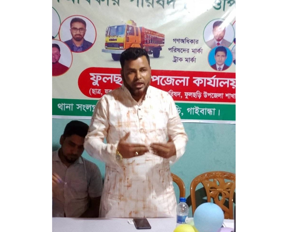 এসময় গাইবান্ধা জেলা গণঅধিকার পরিষদের যুব ও ক্রিয়া বিষয়ক সম্পাদক ও ফুলছড়ি শ্রমিক অধিকার পরিষদের সাবেক সভাপতি রাজা আনসারির সভাপতিত্বে অনুষ্ঠানে আমন্ত্রিত অতিথি হিসেবে বক্তব্য রাখেন গণঅধিকার পরিষদের গাইবান্ধা জেলা শাখার সাধারণ সম্পাদক ও ফুলছড়ি-সাঘাটা (০৫) আসনের নমীনি সামিউল ইসলাম, গাইবান্ধা জেলা গণঅধিকার পরিষদের সিনিয়র সহ-সভাপতি ডা: মো আলতান হোসেন, জেলা ছাত্র অধিকার পরিষদের সাধারণ সম্পাদক এম এ রিপন রবি, সাঘাটা উপজেলা গণঅধিকার পরিষদের সিনিয়র যুগ্ম আহবায়ক আইনুল ইসলাম, জেলা ছাত্র অধিকার পরিষদের সিনিয়র সাধারণ সম্পাদক জুয়েল রানা, জেলা গণঅধিকার পরিষদের সহ প্রচার ও প্রকাশনা সম্পাদক মশিউর রহমান, ফুলছড়ি উপজেলা শ্রমিক অধিকার পরিষদের সাধারণ সম্পাদক শাকিল মিয়া, বৈষম্য বিরোধী ছাত্র আন্দোলন গাইবান্ধা জেলা শাখার মূখপাত্র জাহিদ হাসান জীবনসহ স্থানীয় নেতৃবৃন্দ।