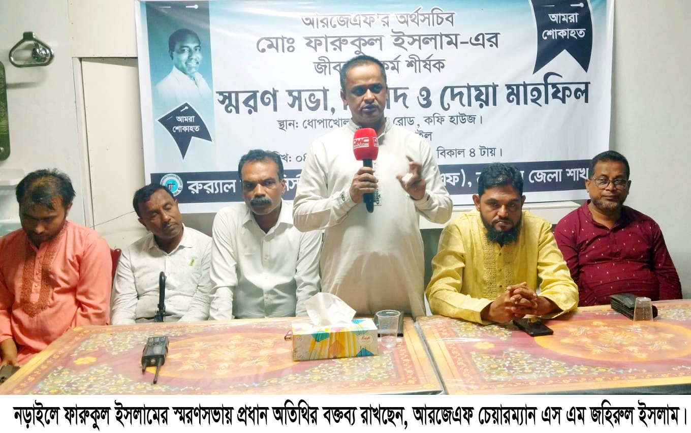নড়াইল প্রতিনিধি: নড়াইলে রুর্যাল জার্নালিস্ট ফাউন্ডেশন (আরজেএফ)’র অর্থ সচিব ফারুকুল ইসলাম এর জীবন ও কর্ম শীর্ষক স্মরণ সভা, মিলাদ ও দোয়া মাহফিল অনুষ্ঠিত হয়েছে।গত ৪জুলাই শুক্রবার বিকাল ৪টায় নড়াইল শহরের ধোপাখোলা মোড়ের পাশে অবস্থিত কফি হাউজে উক্ত স্মরণ সভা অনুষ্ঠিত হয়।