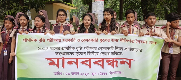 ২০২৫ সালে বৃত্তি পরীক্ষায় অংশ গ্রহণের সুযোগ করে দেওয়ার দাবীতে বেসরকারি প্রাথমিক স্কুলের শিক্ষক শিক্ষার্থী ও অভিবাকগণ মানববন্ধন করেছে। আজ সকাল ১২টার সময় উপজেলা পরিষদের সামনে এ মানববন্ধন অনুষ্টিত হয়। এসময় উপজেলার ৬৫টি প্রাথমিক শিক্ষা প্রতিষ্টানের সহশ্রাধিক শিক্ষার্থী ও শিক্ষকসহ অভিবাবকগণ অংশ গ্রহন করেন।