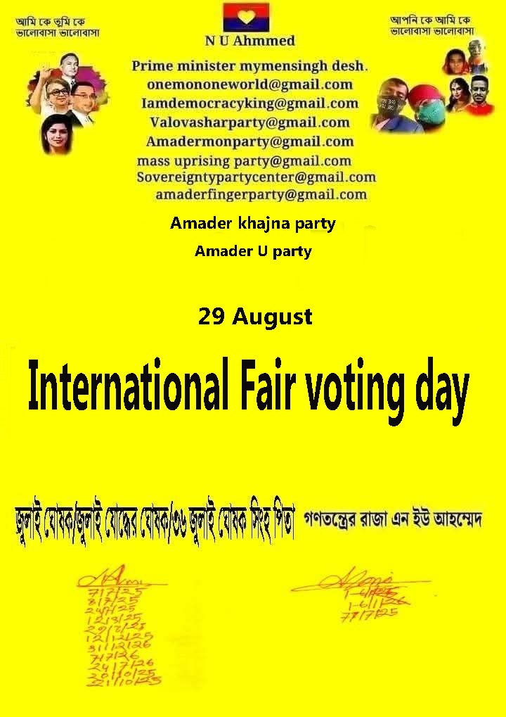 আমাদের খাজনা পার্টি /আমাদের ইউ পার্টি National civic identify party ,, খাজনা মঞ্চ প্রেম ভালোবাসার মঞ্চ জীবন সঙ্গীনি মঞ্চ, অর্থনৈতিক মঞ্চ প্রতিষ্ঠা করেছেন ১২ আগষ্ট গণতন্ত্রের রাজা এন ইউ আহম্মেদ এর ৩১ তম জন্ম দিন বার্ষিকী উপলক্ষ্যে আত্মা প্রকাশ করা হয়েছে। ২৭ টি আন্তর্জাতিক দিবস প্রতিষ্ঠাতা মালিক বলেই গণতন্ত্রের রাজা এন ইউ আহম্মেদ কে সিংহ পিতা এবং জীবন সঙ্গীনি কে সিংহ মাতা আখ্যায়িত কারণ হিসেবে জানিয়েছেন।উল্লেখ্য গরু ছাগল মতো হাঁস মোরগী সিং মাছ মাগুর মাছ লাইট্রে মাছ চিকড়া মাছ কাতলা মাছ রুই মাছ কই মাছ বোয়াল মাছ, ঘ্রাস কাফ জবাই করে এবং কেক কেটে ১২ আগষ্ট গণতন্ত্রের রাজা এন ইউ আহম্মেদ এর ৩১ তম জন্ম দিন এবং আমাদের মন পার্টি প্রতিষ্ঠা বার্ষিকী এবং international mon day দিবস পালন হয়েছে।