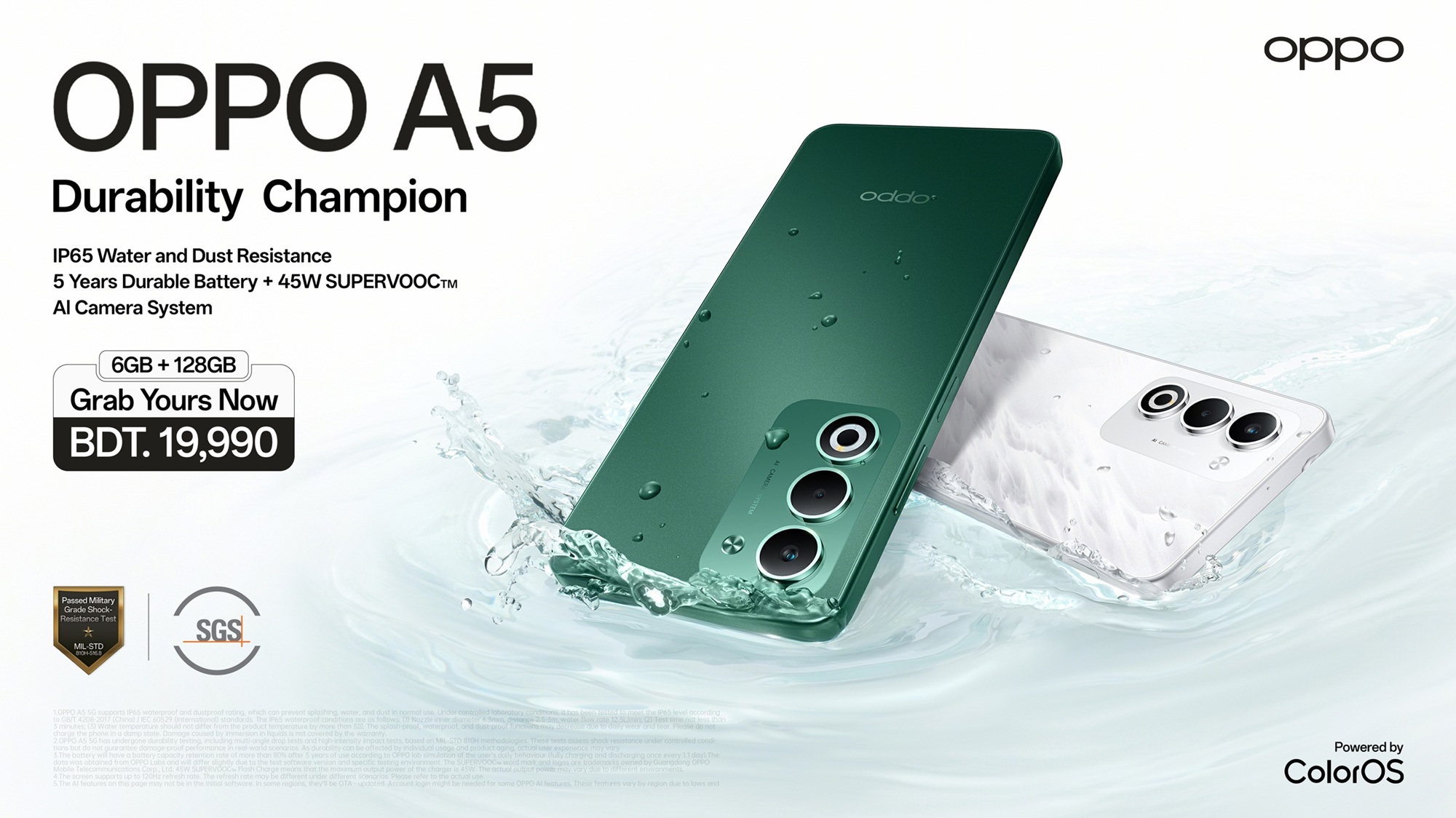ইন্ডাস্ট্রি-সেরা ডিউরেবিলিটি হচ্ছে অপো এ৫-এর মূল বিষয়। এর পাশাপাশি, হঠাৎ ছিটে আসা পানি বা ধুলাবালি থেকে সুরক্ষিত রাখতে এতে ব্যবহৃত আইপি৬৫ ওয়াটার অ্যান্ড ডাস্ট রেজিজট্যান্স আপনার লাইফস্টাইলকে আরও বেশি সক্রিয় করে তুলবে। এর ১৪-স্টার মিলিটারি-গ্রেড শক রেজিজট্যান্স ফোনটিকে হাত থেকে পড়ে যাওয়া বা কোণায় আঘাত পাওয়া থেকে সুরক্ষিত রাখবে; একইসাথে, মর্যাদাপূর্ণ এসজিএস গোল্ড সার্টিফিকেশন থেকে বোঝা যায় যে, ডিভাইসটি যেকোনো প্রতিকূল পরিবেশের জন্য একদম উপযুক্ত। ফোনটি কেবল জীবনের সবচেয়ে কঠিন মুহূর্তগুলোতে আপনাকে সঙ্গ দিবে না, বরং আপনার পারফরম্যান্সকেও একইসাথে নির্ভুল ও নিশ্চিন্ত রাখবে।