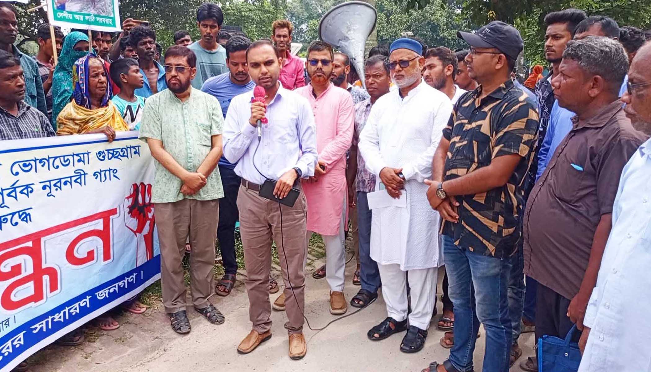 মানববন্ধনে অবিলম্বে ভূমির দস্যু নূরনবী সহ অন্যান্যদের গ্রেপ্তারের দাবী জানিয়ে বক্তব্য রাখেন আব্দুল জব্বার, বাবুল ইসলাম, আদিবাসী নেতা জোসেফ হেমরম পাথরাজ কিস্কু, বাজুন বেসরা, অ্যাড ওয়াড হেমরম, পিউস মুরমু। এ সময় উপস্থিত ছিলেন নারী পুরুষ সহ অসংখ্য গ্রামবাসী।