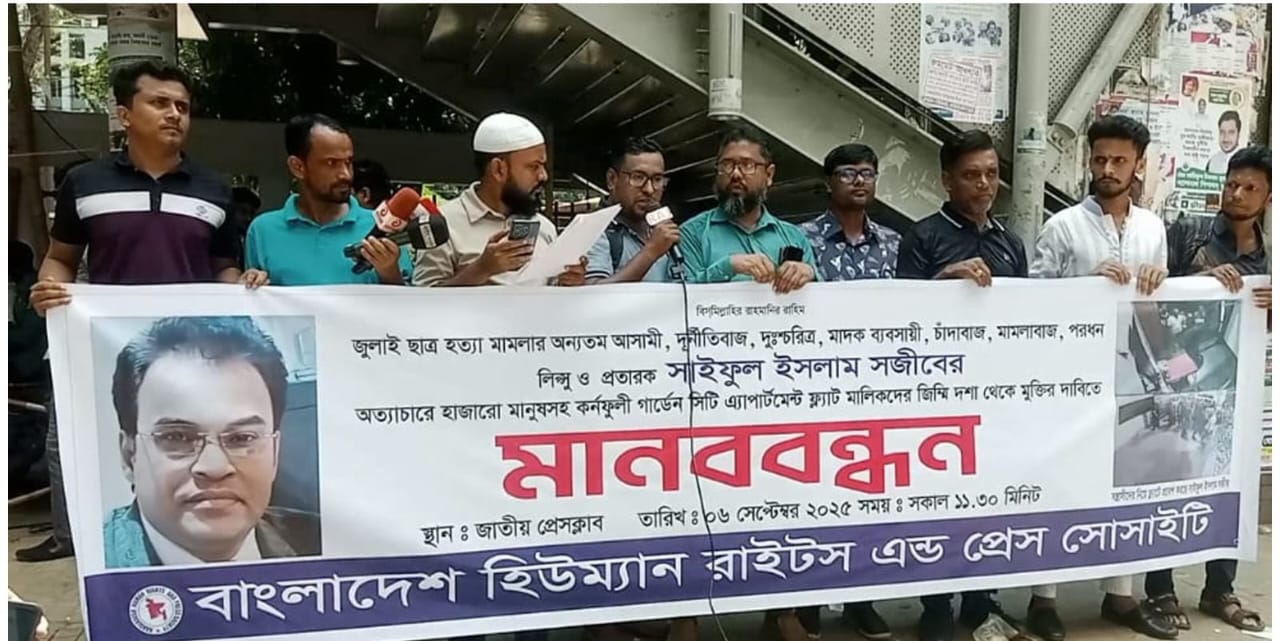নিজস্ব প্রতিবেদক: ৬ সেপ্টেম্বর ২০২৫ ইং, শনিবার সকাল ১১:৩০ মিনিটে জাতীয় প্রেসক্লাবের সামনে বাংলাদেশ হিউম্যান রাইটস অ্যান্ড প্রেস সোসাইটির আয়োজনে এক মানববন্ধন অনুষ্ঠিত হয়।