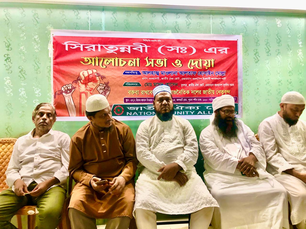 জাতীয় ঐক্য জোটের উদ্যোগে কেন্দ্রীয় কার্যালয়ে জোটের প্রধান সমন্বয়কারী ও ইসলামী জনকল্যাণ পার্টির চেয়ারম্যান আলহাজ্ব মাওলানা আলতাফ হোসাইন মোল্লার সভাপতিত্বে ও জোটের মুখপাত্র বাংলাদেশ মুসলিম সমাজের চেয়ারম্যান মোহাম্মদ মাসুদ হোসেনের পরিচালনায় সিরাতুন্নবী সাল্লাল্লাহু সাল্লাম এর আলোচনা সভায় বিভিন্ন রাজনৈতিক দলের নেতৃবৃন্দ বলেন, রাসুল (সাঃ) এর পৃথিবীতে আগমন হয়েছে বিশ্ব মানবতার কল্যাণে। অন্যান্য নবী রাসূলগণ নিজ নিজ জাতির উপর আগমন ঘটলেও সর্বশেষ নবী হযরত মুহাম্মদ (সাঃ) এর আগমন ঘটেছিল সারা পৃথিবীর মানবজাতির উপর। নবীর আদর্শের প্রথম ভিত্তি হল তিনি ছিলেন আল আমিন অর্থাৎ বিশ্বাসী। মক্কা নগরী ছিল অন্ধকারাচ্ছন্ন বর্বর জাতিদের আবাসস্থল। যেখানে অর্থনীতির অবস্থা ছিল নাজুক। নারীদের সম্ভ্রম ইজ্জত ছিল মূল্যহীন। নারীরা একা চলতে পারত না। খুন ধর্ষণ নিত্যনৈমিত্তিক ঘটনায় পরিণত হয়েছিল। সেই অন্ধকার বর্বর জাতির উপর মহান আল্লাহ পাক রাব্বুল আলামিন রাসূল (সাঃ) এর আগমন ঘটালেন বিশ্ব শান্তির প্রতীক হিসেবে। মক্কা যখন বিজয় হল তখন কাফেররা আতঙ্কগ্রস্ত ছিল। আল্লাহর রাসূল (সাঃ) ঘোষণা করলেন এই মক্কা নগরী আজ থেকে সবার জন্য নিরাপদ। বিধর্মীরা মক্কা নগরীতে বসবাস করতে পারবে কিন্তু শর্ত হলো তাদেরকে জিজিয়া কর দিতে হবে। রাসুল (সাঃ) যাকাত ভিত্তিক অর্থনীতির ব্যবস্থা করলেন। যার মাধ্যমে দ্রুত মক্কার অর্থনৈতিক অবস্থার উন্নতি হল। পর্দার বিধান করলেন,, ব্যভিচার ধর্ষণ বন্ধ হয়ে গেল। হত্যা বন্ধে কেসাস আইন অর্থাৎ হত্যার বদলে হত্যা চালু করলেন, হত্যা বন্ধ হয়ে গেল। এইভাবে কোরআনের বাণী শরিয়া আইন চালুর মাধ্যমে অন্ধকারাচ্ছন্ন বর্বর মক্কা নগরীতে শান্তির আলো ফিরে এলো। আমাদেরকেও রাসুল (সাঃ) এর আদর্শ বুকে ধারণ করে আগামী দিনে বাংলাদেশে ইসলামী কল্যাণ রাষ্ট্র প্রতিষ্ঠায় কাজ করতে হবে।