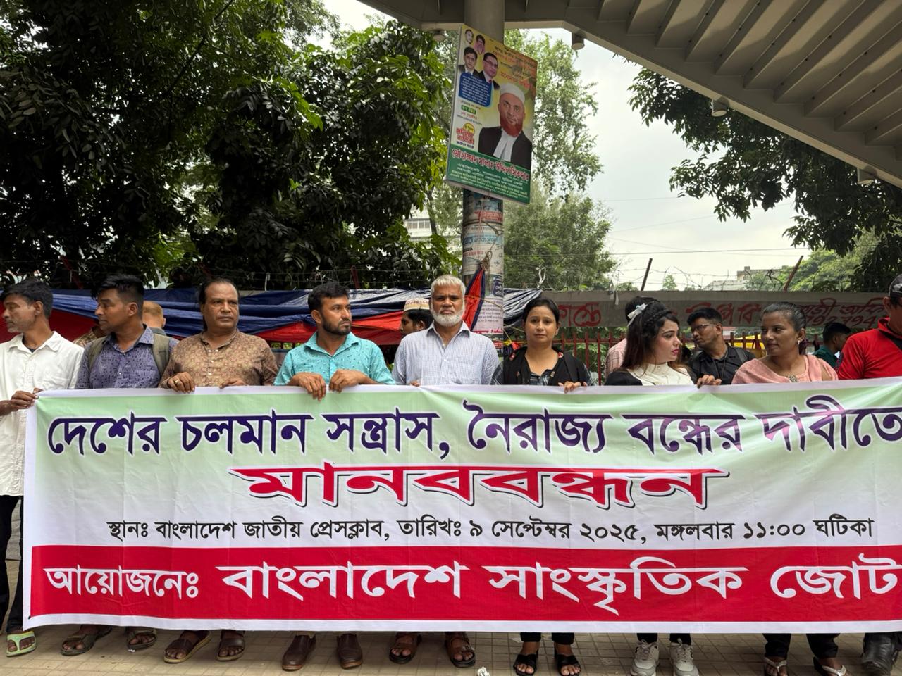অদ্য ৯ সেপ্টেম্বর ২০২৫ সকাল ১১টায় জাতীয় প্রেসক্লাবের সামনে বাংলাদেশ সাংস্কৃতিক জোটের উদ্যোগে সংগঠনের সভাপতি শফিকুল আলম বাবুল এর সভাপতিত্বে সাধারণ সম্পাদক মোহাম্মদ মোস্তফার সঞ্চালনায় দেশে বর্তমান সন্ত্রাস, নৈরাজ্য বন্ধের দাবিতে মানববন্ধন অনুষ্ঠিত হয়। এতে উপস্থিত ছিলেন জোটের কেন্দ্রীয় নেতা কে এম রকিবুল ইসলাম রিপন, মিলন মল্লিক, বাউলশিল্পী করিম শাহ, অভিনেতা এবি বাদল, সঙ্গীতশিল্পী মোঃ রূপক চৌধুরী, রায়হান সুলতান নেহা, জেসমিন আক্তার আনিতা, মোঃ মঞ্জু প্রমুখ। সংহতি জানিয়ে বক্তব্য রাখেন সাংবাদিক সুরক্ষা ফাউন্ডেশনের মহাসচিব রাজু আহমেদ সুজন।