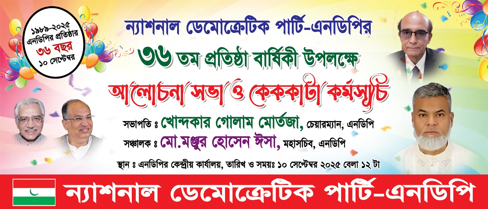 ১৯৮৯-২০২৫, দীর্ঘ ছত্রিশ বছরের রাজনৈতিক যাত্রা। বাংলাদেশে বহুদলীয় গণতন্ত্রের বিকাশের এক গুরুত্বপূর্ণ সময়ের আবির্ভাব ঘটে ন্যাশনাল ডেমোক্রেটিক পার্টি–এনডিপির জন্মের মাধ্যমে। সময়টা ছিল ১৯৮৯ সালের ১০ সেপ্টেম্বর, দেশপ্রেমিক জাতীয়তাবাদ ও ইসলামী মূল্যবোধকে ধারণ করে ন্যায় বিচার, দুর্নীতিমুক্ত বাংলাদেশ এবং মুক্তিযুদ্ধের চেতনা সমুন্নত রাখার প্রত্যয়ে এনডিপির আত্মপ্রকাশ ঘটে।
