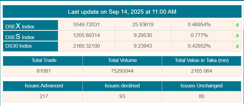 দেশের প্রধান পুঁজিবাজার ঢাকা স্টক এক্সচেঞ্জে (ডিএসই) সপ্তাহের প্রথম কার্যদিবস রোববার (১৪ সেপ্টেম্বর) মূল্যসূচকের উত্থানের মধ্য দিয়ে চলছে লেনদেন। বেড়েছে বেশির ভাগ কোম্পানির শেয়ারদর।