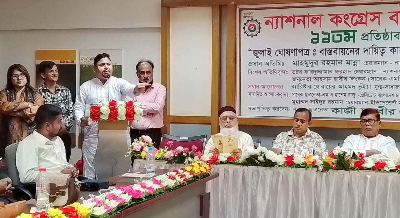 ১৭ই সেপ্টেম্বর ২০২৫, বুধবার সকাল ১০ টায় জাতীয় প্রেসক্লাবের ২য় তলায় তোফাজ্জল হোসেন মানিক মিয়া হলে (ভিআইপি লাউঞ্জ) ন্যাশনাল কংগ্রেস বাংলাদেশ-এনসিবি’র ১১তম প্রতিষ্ঠা বার্ষিকী উপলক্ষে “জুলাই ঘোষণাপত্র ঃ বাস্তবায়নের দায়িত্ব কার? শীর্ষক আলোচনা সভা” ও জুলাই কবিতা পাঠ অনুষ্ঠানে সভাপতির বক্তব্যে তিনি এ আহবান জানান।