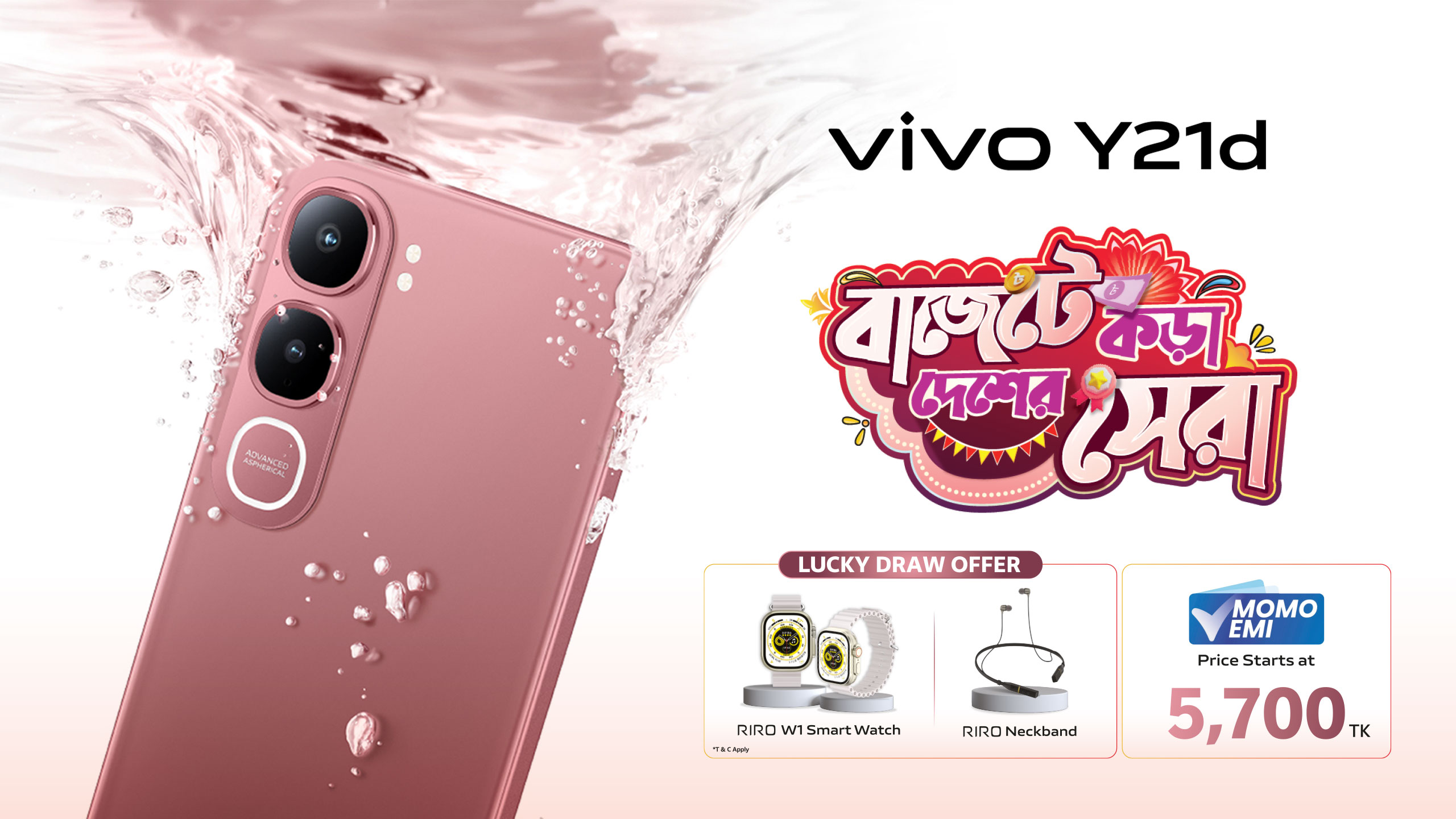 ঢাকা, ১৭ সেপ্টেম্বর, ২০২৫: প্রতিদিন যাদের নিরলস পরিশ্রম আমাদের জীবনকে সহজ করে তোলে, আর যাদের হাত ধরেই গড়ে ওঠে আগামীর স্বপ্ন তাদের জন্যই ভিভো নিয়ে এলো বাজেটে কড়া দেশের সেরা স্মার্টফোন—ভিভো ওয়াই২১ডি। কড়া বাজেটে ভিভো এই ফোনে দিচ্ছে অলরাউন্ড ওয়াটারপ্রুফ নিশ্চয়তা ও শক্তিশালী ৬৫০০ এমএএইচ ব্লুভোল্ট ব্যাটারি, যা ব্যবহারকারীদের দেবে সারাদিনের সুরক্ষা আর চার্জ নিয়ে দুশ্চিন্তামুক্ত অভিজ্ঞতা।