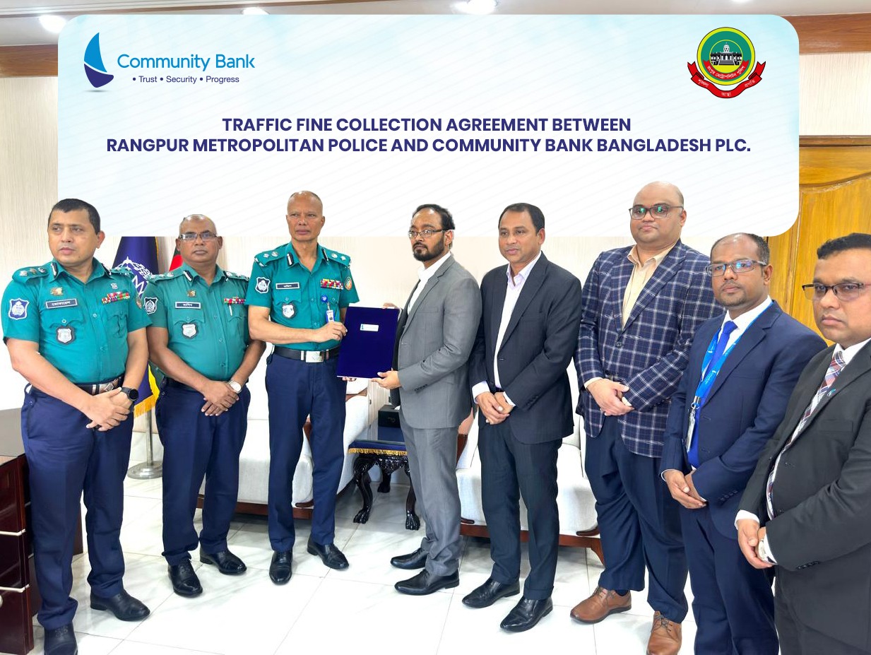 বুধবার (সেপ্টেম্বর ২৪, ২০২৫), কমিউনিটি ব্যাংক বাংলাদেশ পিএলসি. -এর মাধ্যমে রংপুর মেট্রোপলিটন পুলিশের ট্রাফিক মামলার ফাইন কালেকশনের উদ্বোধন করা হয়। ট্রাফিক ফাইন কালেকশনের লক্ষ্যে রংপুর মেট্রোপলিটন পুলিশ ও কমিউনিটি ব্যাংকের মধ্যে একটি দ্বিপাক্ষিক চুক্তি স্বাক্ষরিত হয়েছে। স্বাক্ষরিত চুক্তিটি আনুষ্ঠানিকভাবে বিনিময় করেন রংপুর মেট্রোপলিটন পুলিশ কমিশনার জনাব মো. মজিদ আলী বিপিএম এবং কমিউনিটি ব্যাংকের ব্যবস্থাপনা পরিচালক (চলতি দায়িত্ব) জনাব কিমিয়া সাআদত। চুক্তি স্বাক্ষর শেষে রংপুর মেট্রোপলিটন পুলিশের কমিশনার জনাব মো. মজিদ আলী বিপিএম ট্রাফিক মামলার ফাইন কালেকশনের আনুষ্ঠানিক উদ্বোধন ঘোষণা করেন। এই অনুষ্ঠানে উপস্থিত ছিলেন জনাব মো. হাবিবুর রহমান, অ্যাডিশনাল ডিআইজি, ডিসি (হেডকোয়ার্টার্স), রংপুর মেট্রোপলিটন পুলিশ; জনাব মো. তোফায়েল আহমেদ, অ্যাডিশনাল ডিআইজি, ডিসি (ক্রাইম), রংপুর মেট্রোপলিটন পুলিশ; কমিউনিটি ব্যাংকের হেড অব করপোরেট ব্যাংকিং ও হেড অব বিজনেস (ব্রাঞ্চ) ড. মো. আরিফুল ইসলাম; হেড অব এডিসি ও হেড অব এমডি’স কো-অর্ডিনেশন টিম জনাব মোঃ মামুন উর রহমান; রাণীরবন্দর ব্রাঞ্চের শাখা ব্যবস্থাপক জনাব মোঃ মুনির উদ্দিন; রংপুর সদর সাব ব্রাঞ্চের ইনচার্জ জনাব মো. নুরুল ইসলামসহ উর্ব্ধতন কর্মকর্তারা।