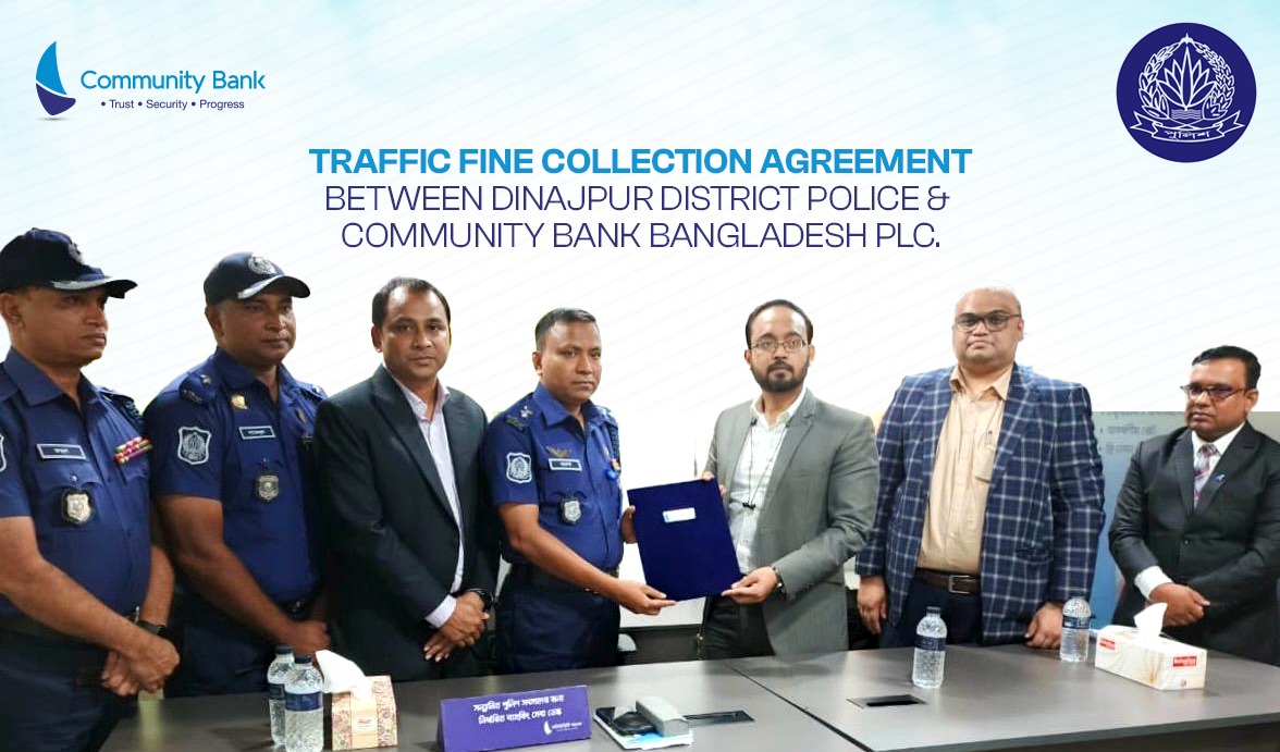 বুধবার (সেপ্টেম্বর ২৪, ২০২৫), কমিউনিটি ব্যাংক বাংলাদেশ পিএলসি. -এর মাধ্যমে দিনাজপুর জেলা পুলিশের ট্রাফিক মামলার ফাইন কালেকশনের উদ্বোধন করা হয়। ট্রাফিক ফাইন কালেকশনের লক্ষ্যে দিনাজপুর জেলা পুলিশ ও কমিউনিটি ব্যাংকের মধ্যে একটি চুক্তি স্বাক্ষরিত হয়েছে।
