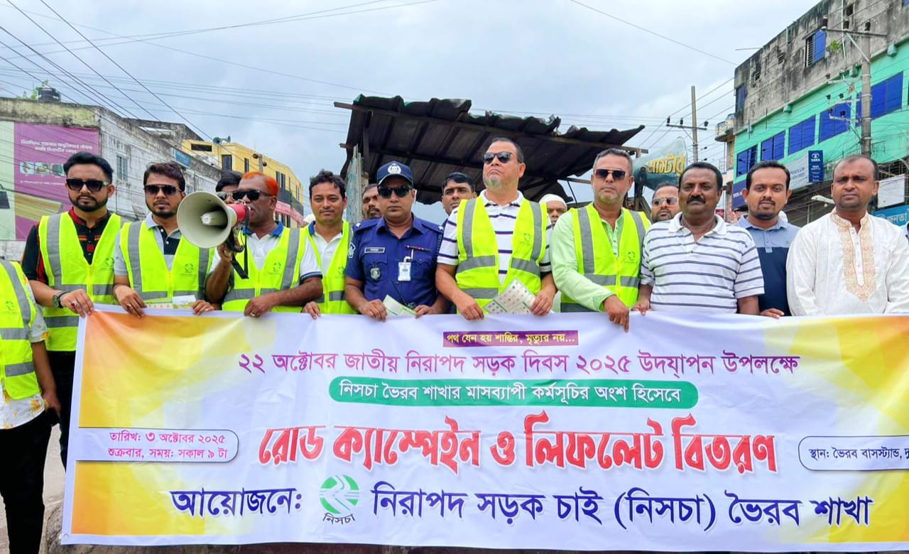 ইমন মাহমুদ লিটন, ভৈরব(কিশোরগঞ্জ)প্রতিনিধি: “পথ যেন হয় শান্তির, মৃত্যুর নয়”—এই স্লোগানকে ধারণ করে আজ শুক্রবার ০৩ অক্টোবর ২০২৫ সকালে ঢাকা সিলেট ও ভৈরব ময়মনসিংহ সড়কের ভৈরব প্রান্তর ভৈরব বাসস্ট্যান্ড দুর্জয় চত্বরে অনুষ্ঠিত হয়েছে নিরাপদ সড়ক চাই (নিসচা) ভৈরব শাখার রোড ক্যাম্পেইন ও লিফলেট বিতরণ কর্মসূচি। ২২ অক্টোবর জাতীয় নিরাপদ সড়ক দিবস ২০২৫ উদযাপন উপলক্ষে মাসব্যাপী কর্মসূচির অংশ হিসেবে আয়োজিত এ কর্মসূচিতে যাত্রী, চালক ও পথচারীদের মাঝে সচেতনতামূলক লিফলেট বিতরণ করা হয়।