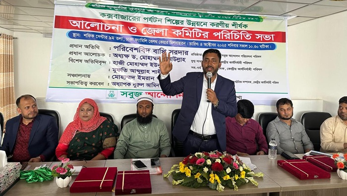 কক্সবাজার জেলার পর্যটন শিল্পের উন্নয়নে করণীয় শীর্ষক আলোচনা ও সবুজ আন্দোলনের জেলা কমিটির পরিচিতি সভা অনুষ্ঠিত হয়েছে। শনিবার সকালে (৪ অক্টোবর ২০২৫) কক্সবাজার জেলা শহরের শফিক সেন্টারে ঢাকা ফ্যামিলি হেলথ্ কেয়ার মিলনায়তনে কক্সবাজার জেলার সাধারণ সম্পাদক মো. ইমরান খানের সঞ্চালনা ও জেলার সভাপতি অধ্যাপক নুরুল আমিন সিকদার ভুট্টোর সভাপতিত্বে প্রধান অতিথি হিসেবে উপস্থিত ছিলেন সবুজ আন্দোলনের প্রতিষ্ঠাতা ও পরিচালনা পরিষদের চেয়ারম্যান পরিবেশবিদ বাপ্পি সরদার। প্রধান আলোচক হিসেবে উপস্থিত ছিলেন কক্সবাজার চেম্বারের সভাপতি ও সবুজ আন্দোলন কেন্দ্রীয় কার্যনির্বাহী পরিষদের যুগ্ম সাধারণ সম্পাদক অধ্যক্ষ ড. মোহাম্মদ সানাউল্লাহ। বিশেষ অতিথি ছিলেন কেন্দ্রীয় কার্যনির্বাহী পরিষদের সহ-ধর্ম বিষয়ক সম্পাদক হাজী মোহাম্মদ ইউনুস, ইসলামী চিন্তাবিদ মুফতি আব্দুল্লাহ শাহীন।