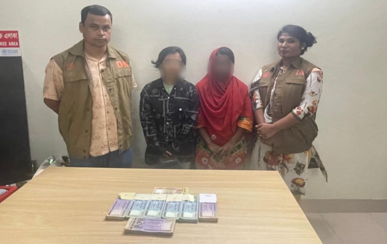 লিটন পাঠান, হবিগঞ্জ প্রতিনিধি: হবিগঞ্জের মাধবপুর উপজেলায় ৪ লাখ ৫০ হাজার টাকার জাল নোটসহ দুই তরুণীকে গ্রেপ্তার করেছে জেলা পুলিশের গোয়েন্দা শাখা (ডিবি)। মঙ্গলবার (৭-অক্টোবর) রাতে উপজেলার নোয়াপাড়া বাজার এলাকা থেকে তাদের গ্রেপ্তার করা হয়। গ্রেপ্তারকৃতরা হলেন মাধবপুরের সুলতানপুর গ্রামের নজরুল ইস। হবিগঞ্জ জেলা ডিবির অফিসার ইনচার্জ (ওসি) একেএম শামীম হাসান জানান, রোজা ও তার মা দীর্ঘদিন ধরে নোয়াপাড়া বাজারে জালনোট দিয়ে ব্যবসায়ীদের সঙ্গে প্রতারণা করতেন।