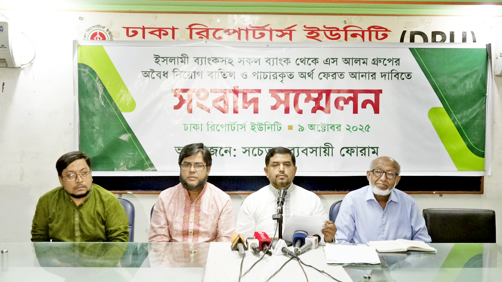 এস আলম গ্রুপ কর্তৃক পাচারকৃত অর্থ ফেরত আনয়ন এবং ইসলামী ব্যাংকসহ অন্যান্য ব্যাংকে অবৈধভাবে নিয়োগকৃত কর্মকর্তা-কর্মচারীদের নিয়োগ বাতিলের দাবিতে ৯ অক্টোবর ২০২৫, বৃহস্পতিবার সচেতন ব্যবসায়ী ফোরামের উদ্যোগে ঢাকা রিপোর্টার্স ইউনিটিতে এক সংবাদ সম্মেলন অনুষ্ঠিত হয়। সংবাদ সম্মেলনে লিখিত বক্তব্য পাঠ করেন ব্যবসায়ী মোঃ মুস্তাফিজুর রহমান। এসময় সাংবাদিকদের প্রশ্নের উত্তর দেন হকস বে এর চেয়ারম্যান ও বারভিডা-এর সভাপতি আব্দুল হক ও বাংলাদেশ পুঁজিবাজার বিনিয়োগকারী সম্মিলিত পরিষদের সভাপতি আ ন ম আতাউল্লাহ নাঈম।