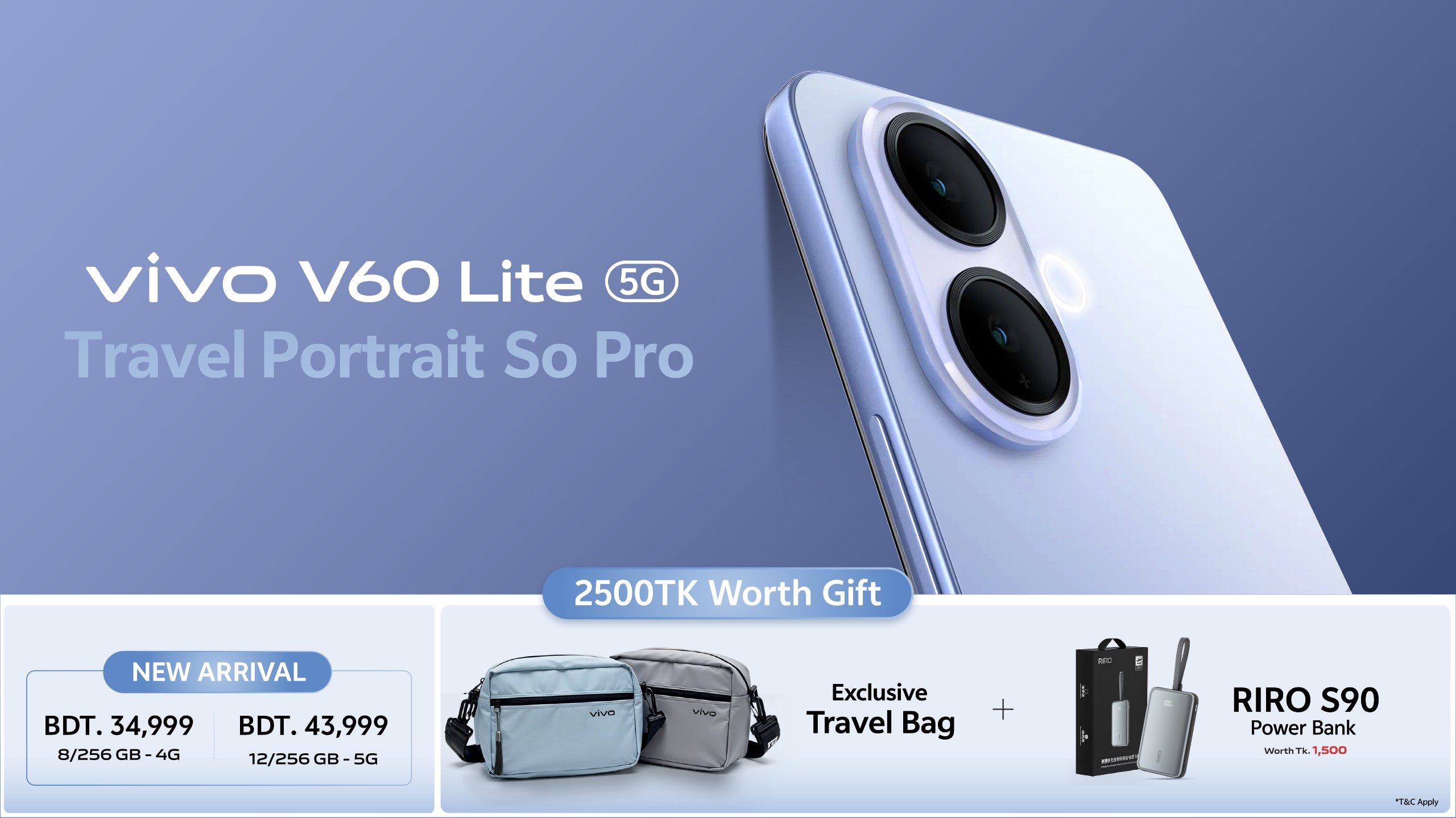 আকর্ষণীয় অফারের সাথে বাজারে এসেছে ভিভো ভি৬০ লাইট। ফাইভজি এবং ফোরজি দুটি সংস্করণে ফোনের দাম যথাক্রমে ৪৩,৯৯৯ টাকা ও ৩৪,৯৯৯ টাকা। ক্রেতারা পাচ্ছেন ২৫০০ টাকার বিশেষ গিফট প্যাক জেতার সুযোগ, যাতে রয়েছে স্টাইলিশ ট্রাভেল ব্যাগ এবং রিরো এস৯০ পাওয়ার ব্যাংক। এছাড়া, ক্রেডিট কার্ড ছাড়াই মাত্র ৭,০০০ টাকা থেকে মোমো কিস্তিতে ফোনটি কেনা যাবে।
