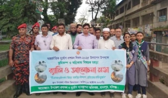 লিটন পাঠান, হবিগঞ্জ প্রতিনিধি: হবিগঞ্জের মাধবপুরে পালিত হয়েছে আন্তর্জাতিক দুর্যোগ প্রশমন দিবস-২০২৫। সমন্বিত উদ্যোগ, প্রতিরোধ করি দুর্যোগ এই প্রতিপাদ্যকে সামনে রেখে, সোমবার (১৩-অক্টোবর) সকালে উপজেলা প্রশাসন ও দুর্যোগ ব্যবস্থাপনা বিভাগের আয়োজনে ভূমিকম্প ও অগ্নিকান্ড বিষয়ক মহড়া এবং বর্ণাঢ্য র্যালি ও আলোচনা সভা অনুষ্ঠিত হয়। র্যালিটি উপজেলা পরিষদ চত্বর থেকে শুরু হয়ে শহরের প্রধান প্রধান সড়ক প্রদক্ষিণ করে একই স্থানে এসে শেষ হয়। অনুষ্ঠানে উপস্থিত ছিলেন উপজেলা নির্বাহী কর্মকর্তা জাহিদ বিন কাশেম, উপজেলা প্রকল্প বাস্তবায়ন কর্মকর্তা মাধবপুর ফায়ার সার্ভিসের স্টেশন কর্মকর্তা, পৌর বিএনপির সাধারণ সম্পাদক আলাউদ্দিন আল রনি, বিভিন্ন দপ্তরের কর্মকর্তা, শিক্ষক, শিক্ষার্থী, স্কাউট সদস্য ও স্থানীয় গণ্যমান্য ব্যক্তিবর্গ।