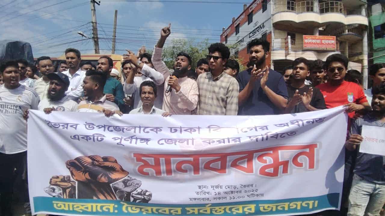 মঙ্গলবার (১৪ অক্টোবর) বেলা সাড়ে ১১টার দিকে ভৈরবের মুক্তিযুদ্ধের স্মৃতি ভাস্কর্য ‘দুর্জয় ভৈরব’ চত্বরে ‘ভৈরবের সর্বস্তরের জনগণ’ ব্যানারে এ কর্মসূচির আয়োজন করা হয়। ঘন্টা ব্যাপী বিক্ষোভ সমাবেশ করে, পরে তাঁরা ঢাকা -সিলেট মহাসড়কে মানববন্ধন কর্মসূচী পালন করেন।