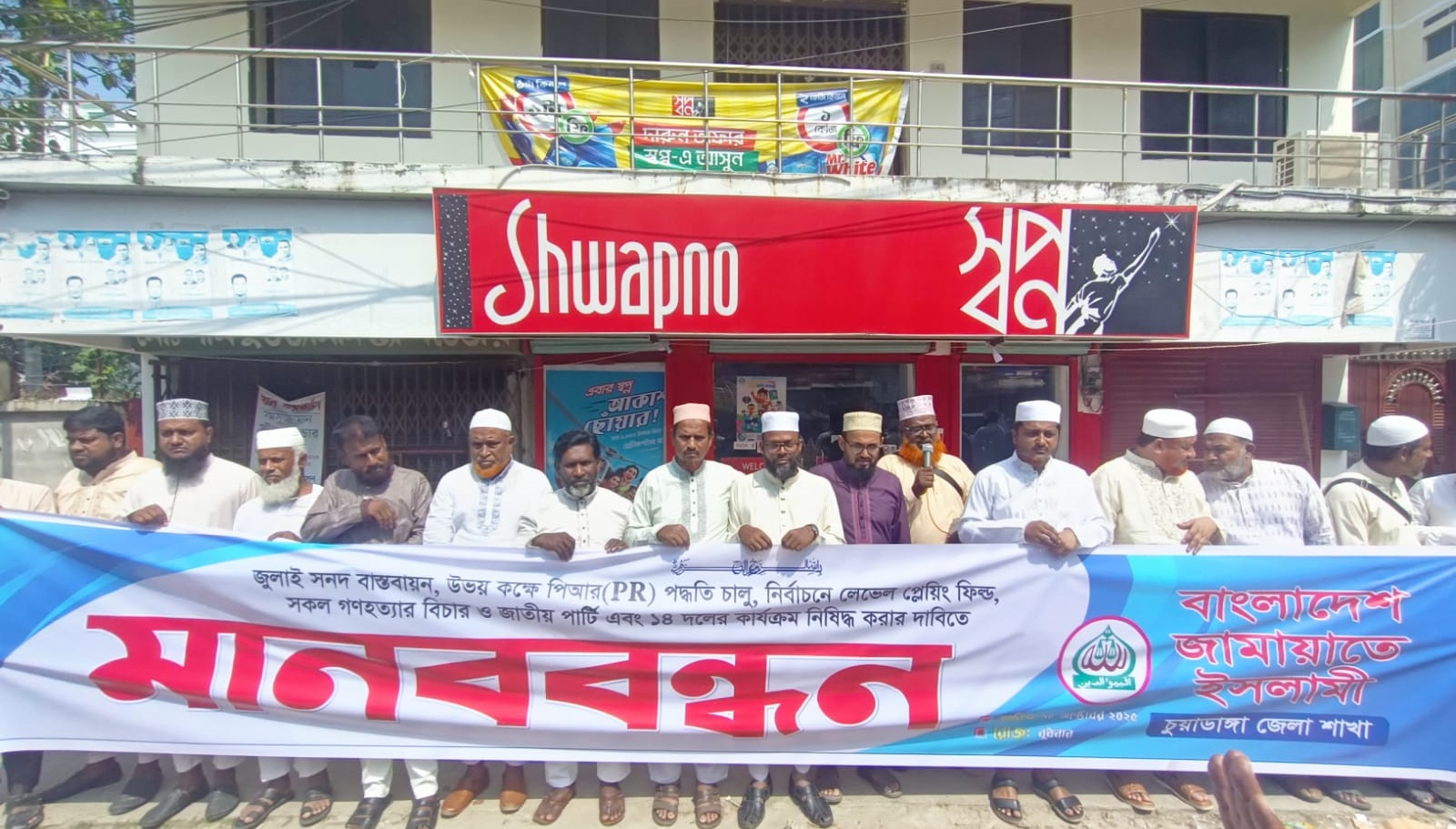 মোঃ আব্দুল্লাহ হক, চুয়াডাঙ্গা প্রতিনিধি: প্রপোশনাল রিপ্রেজেন্টেশন (PR) পদ্ধতিতে নির্বাচন, জুলাই সনদ বাস্তবায়নসহ পাঁচ দফা দাবিতে চুয়াডাঙ্গা প্রেসক্লাবের সামনে আজ ১৫ অক্টোবর বুধবার সকাল ১১ টার সময় চুয়াডাঙ্গা প্রেসক্লাবের সামনে মানববন্ধন কর্মসূচি পালন করেছে বাংলাদেশ জামায়াতে ইসলামী চুয়াডাঙ্গা জেলা শাখা। মানববন্ধনে জামায়াতে ইসলামী ও অঙ্গসংগঠনের নেতাকর্মীরা উপস্থিত ছিলেন। তাঁদের হাতে ছিল দাবি সংবলিত ব্যানার ও ফেস্টুন।