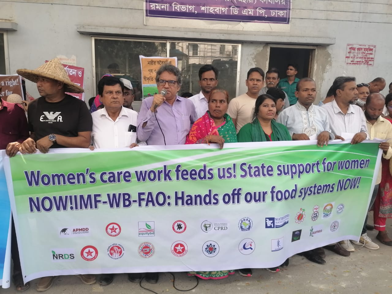 বক্তারা বলেন, ২০২৫ সালে IMF, বিশ্বব্যাংক ও FAO-এর ৮০তম প্রতিষ্ঠাবার্ষিকী পালিত হচ্ছে। এই দীর্ঘ সময় আমাদের দেখিয়েছে কিভাবে বৈশ্বিক অর্থনৈতিক প্রতিষ্ঠান ও আন্তর্জাতিক সংস্থা স্থানীয় কৃষক, নারী শ্রমিক ও সম্প্রদায়ের অধিকার হরণ করে খাদ্য, জমি ও পানিকে বাণিজ্যিকীকরণের হাতিয়ার হিসেবে ব্যবহার করেছে। বৈশ্বিক উত্তর দেশগুলো তাদের নীতি ও কর্পোরেট শাসনের মাধ্যমে আমাদের খাদ্য, পানি ও প্রাকৃতিক সম্পদ নিয়ন্ত্রণ করেছে, আর ক্ষতিগ্রস্ত হয়েছেন ছোট কৃষক, নারী, শহুরে দরিদ্র ও স্থানীয় সম্প্রদায়। নারী কৃষক, শ্রমিক ও নারীযত্নশ্রমীরা খাদ্য উৎপাদন, সংরক্ষণ এবং পরিবেশ রক্ষার মূল শক্তি। কিন্তু তাদের অবদানকে রাষ্ট্রীয় স্বীকৃতি না দেয়ায়, বৈষম্য ও কর্পোরেট দখল থেকে নিরাপত্তা নিশ্চিত না হওয়ায় খাদ্য সার্বভৌমত্ব কখনো নিশ্চিত হচ্ছে না। জলবায়ু পরিবর্তন, তাপপ্রবাহ, বন্যা, খরা, ঘূর্ণিঝড় এবং শিল্পায়িত কৃষির প্রভাব আমাদের খাদ্য উৎপাদনে বড় হুমকি সৃষ্টি করছে।
