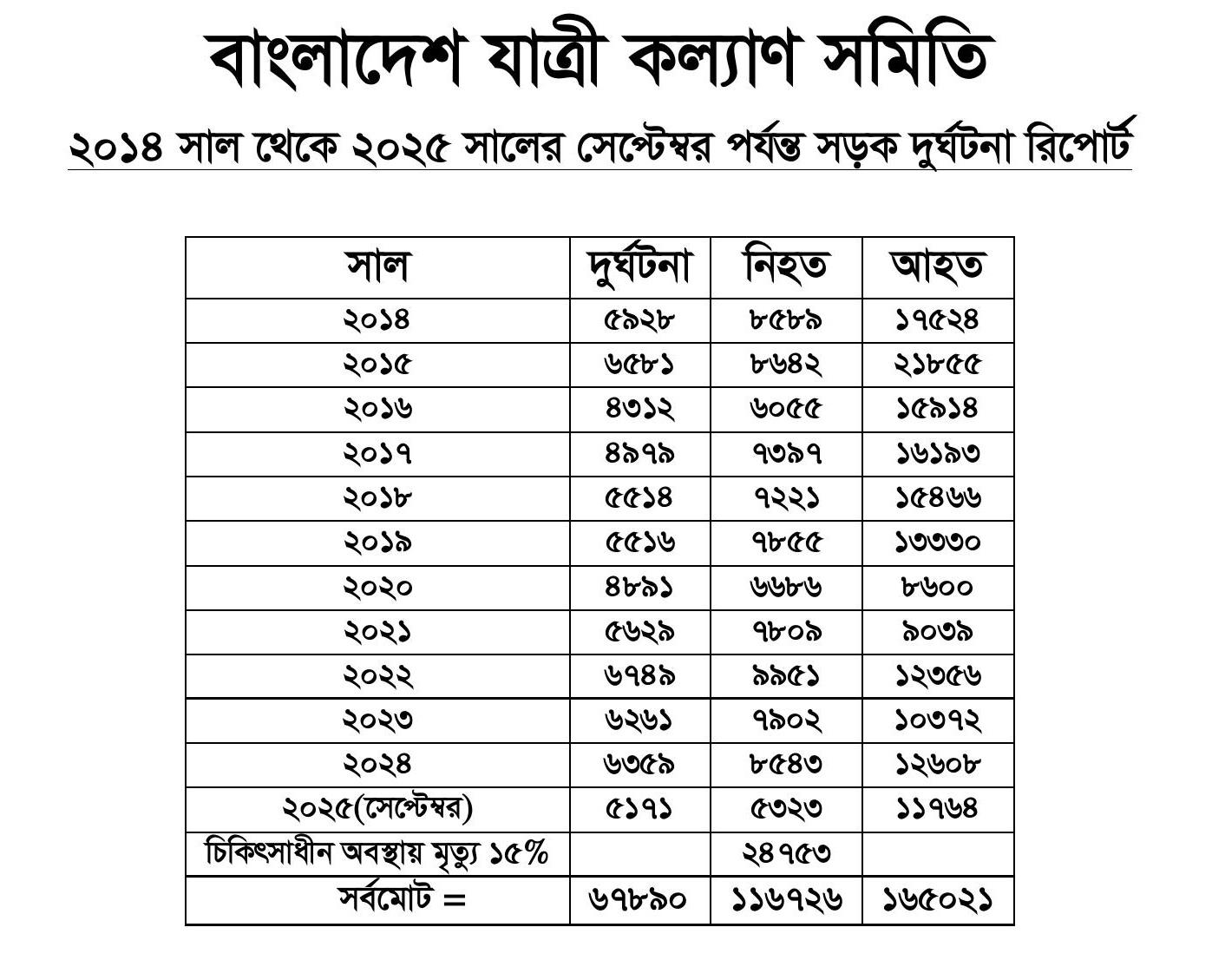লিখিত বক্তব্যে তিনি বলেন, সড়ক পরিবহন সেক্টরে বিগত আওয়ামীলীগ সরকারের সীমাহীন অনিয়ম-দুর্নীতি, অব্যবস্থাপনা, পরিবহন মালিক-শ্রমিক ও কতিপয় দুর্নীতিবাজ পুলিশ কর্মকর্তাদের চাদাঁবাজি ও নৈরাজ্যের কারণে সড়কের বিশৃঙ্খলা, ফিটনেসবিহীন যানবাহনের অবাধে চলাচল, লাইসেন্সবিহীন চালক, অপ্রাপ্ত বয়স্ক চালক, সড়কে ত্রুটি, চালকের মাদক গ্রহন, বেপরোয়া গতি, অযোগ্য চালকের হাতে লাইসেন্স প্রদান, লাইসেন্সবিহীন-প্রশিক্ষণহীন চালকের হাতে যানবাহন তুলে দেওয়াসহ নানান কারনে বিগত আওয়ামীলীগ সরকারের সময়ের ২০১৪ সাল থেকে অন্তবর্তী সরকারের ২০২৫ সালের সেপ্টেম্বর পর্যন্ত বিগত একযুগে দেশে গণমাধ্যমে প্রকাশিত তথ্যানুযায়ী ৬৭,৮৯০ টি সড়ক দুর্ঘটনায় ১,১৬,৭২৬ জন নিহত ও ১,৬৫,০২১ জন আহত হয়েছে। বাংলাদেশ যাত্রী কল্যাণ সমিতি শুধুমাত্র গণমাধ্যম পর্যবেক্ষণ করে এই তথ্য পেলেও দেশের হাসপাতালগুলোর চিত্র বলছে হতাহতের সংখ্যা কয়েকগুণ বেশি। একই সময়ে ইসরাইল-ফিলিস্তিন যুদ্ধে গাজায় নিহতের সংখ্যা ৬৭ হাজার। ইউক্রেন-রাশিয়া যুদ্ধে নিহতের সংখ্যা ৪৫ হাজার। এসব যুদ্ধে যে পরিমাণ লোক মারা গেছে বাংলাদেশের সড়ক দুর্ঘটনায় নিহত তার চেয়ে কয়েকগুণ বেশী। এমন ধারাবাহিক সড়কহত্যা বন্ধে বর্তমান অন্তবর্তী সরকারের কার্যক্রমও প্রশ্নবিদ্ধ।
