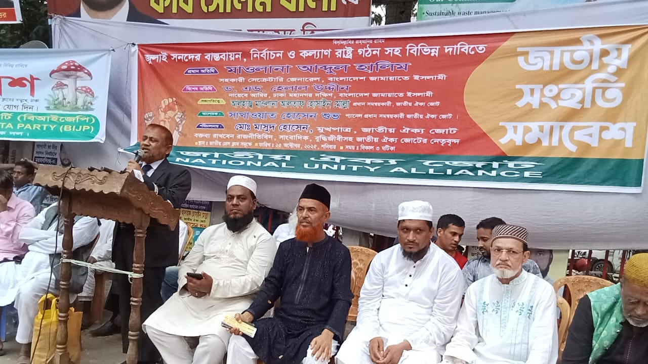 আজ ২৫ অক্টোবর ২০২৫ জাতীয় প্রেসক্লাবের সম্মুখে জাতীয় ঐক্য জোটের উদ্যোগে জুলাই সনদ বাস্তবায়ন, নির্বাচন ও কল্যাণ রাষ্ট্র গঠন সহ বিভিন্ন দাবিতে জাতীয় সংহতি সমাবেশে নেতৃবৃন্দ বলেন, অন্তর্বর্তীকালীন সরকারকে জুলাই সনদ বাস্তবায়ন করতে হবে। আগামী জাতীয় সংসদ নির্বাচন করতে হলে আগে গণভোটের মাধ্যমে জনগণের সমর্থন নিতে হবে। বর্তমান সংবিধানের আলোকে জুলাই সনদ বাস্তবায়ন ও জাতীয় সংসদ নির্বাচন করা আইনসিদ্ধ হবে না। সরকার যদি এই ভুল করে আগামী দিনে অন্তর্বর্তীকালীন সরকারের দায়িত্বশীল ব্যক্তিদের বিচারের কাঠগড়ায় দাঁড়াতে হতে পারে। তাদের বুঝা দরকার ৫ই আগস্টের পরাজিত শক্তি পিছনে আছে শক্তিশালী ভারত। যারা বরাবরই আমাদের স্বাধীনতা সার্বভৌমত্ব আইনের শাসন সংস্কৃতি অর্থনীতি গণতন্ত্র সবকিছু নিয়ে চক্রান্তে লিপ্ত।