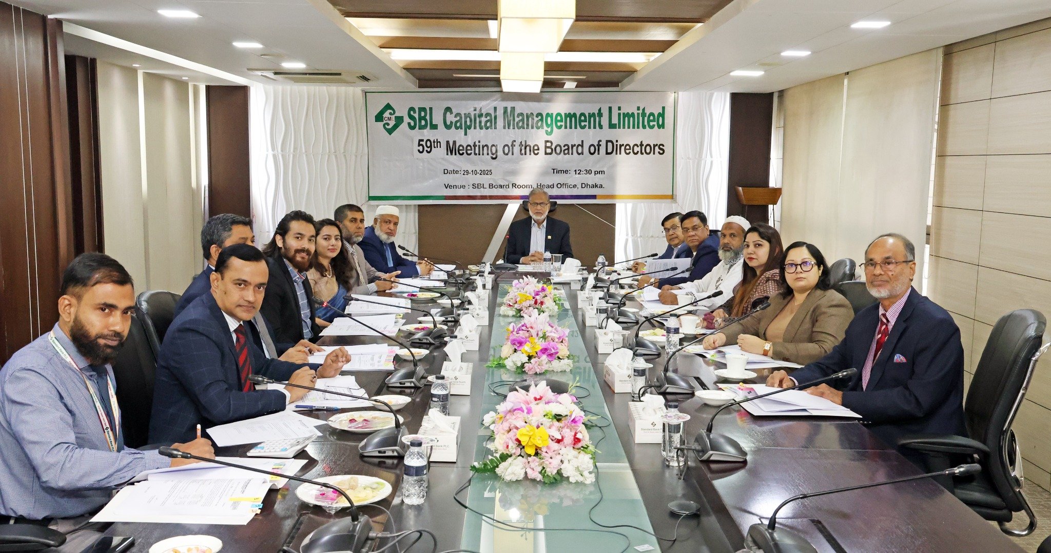 এসবিএল ক্যাপিটাল ম্যানেজমেন্ট লিমিটেড এর ৫৯তম বোর্ড সভা ২৯ অক্টোবর ২০২৫ ইং তারিখে ব্যাংকের প্রধান কার্যালয়ের বোর্ডরুমে সম্মানিত চেয়ারম্যান কামাল মোস্তফা চৌধুরী এর সভাপতিত্বে অনুষ্ঠিত হয়। উক্ত সভায় উপস্থিত ছিলেন পরিচালনা পর্ষদের সম্মানিত সদস্য এস. এ. এম. হোসাইন, গুলজার আহমেদ, মোঃ হাবিবুর রহমান, শেখ ওমর ফারুক, ফারিয়া সুলতানা সুমা, জুবাইদা খান, ইনতিশার মোস্তফা চৌধুরী, অনিভা সাহা এবং গোলাম হাফিজ আহমেদ। সভায় আরো উপস্থিত ছিলেন ব্যাংকের উপব্যবস্থাপনা পরিচালক মোঃ সিদ্দিকুর রহমান, কোম্পানি সেক্রেটারি মোঃ মিজানুর রহমান এফসিএস এবং এসবিএল ক্যাপিটাল ম্যানেজমেন্ট লিমিটেড এর প্রধান নির্বাহী কর্মকর্তা আবদুর রহিম চৌধুরী।