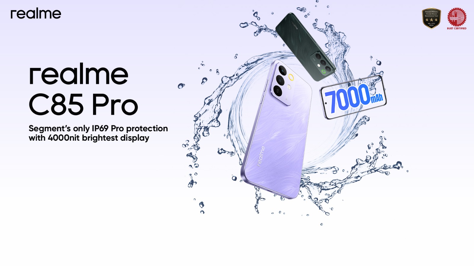 বাংলাদেশে বহুল প্রতীক্ষিত রিয়েলমি সি৮৫ প্রো উন্মোচনের ঘোষণা দিয়েছে তরুণদের পছন্দের স্মার্টফোন ব্র্যান্ড রিয়েলমি। ‘ক্যাটাগরির প্রথম অফিসিয়াল ওয়াটারপ্রুফ স্মার্টফোন’ রিয়েলমি সি৭৫-এর অবিশ্বাস্য সাফল্যের ধারাবাহিকতায় এই সেগমেন্টের সবচেয়ে ওয়াটার-রেজিজট্যান্ট ও উজ্জ্বলতম ফোন হিসেবে এটি নিয়ে আসা হলো।