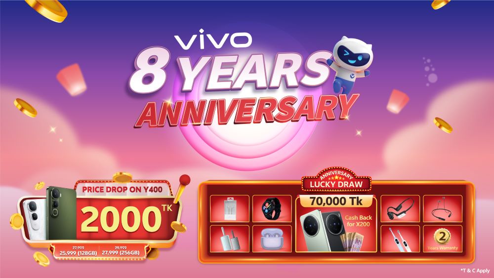 ৮ম বার্ষিকী উপলক্ষে ভিভো ওয়াই৪০০ মডেলে থাকছে বিশেষ ২,০০০ টাকার মূল্যছাড়, যা গ্রাহকদের জন্য অফারটিকে আরও আকর্ষণীয় করে তুলেছে।