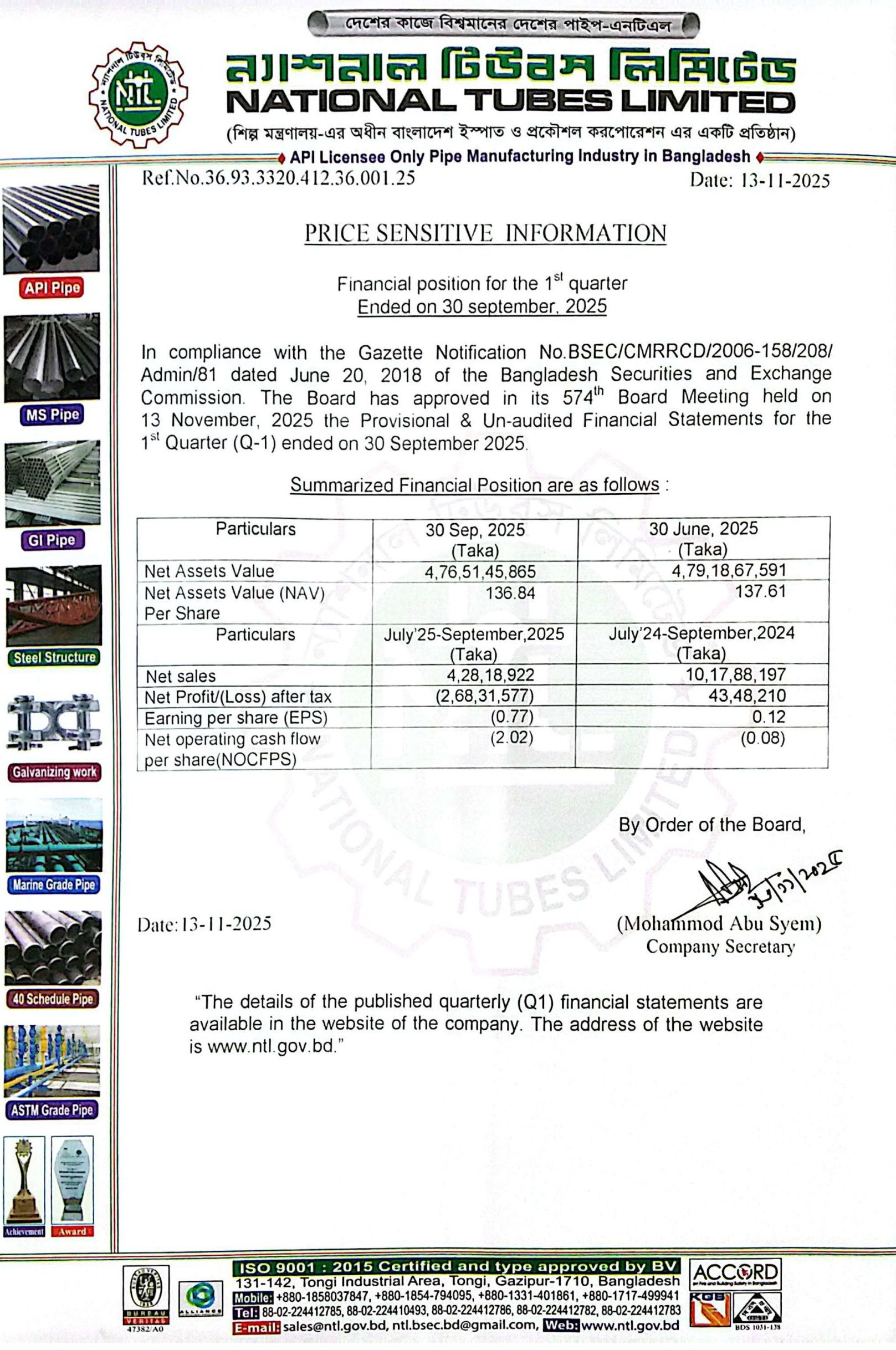 Price Sensitive Information (Q1) of National Tubes Limited