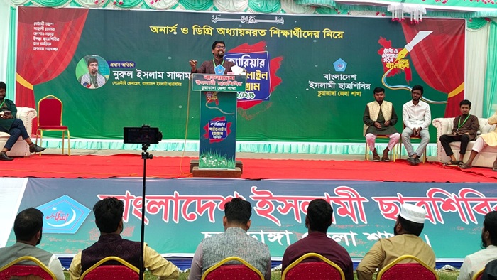 মোঃ আব্দুল্লাহ হক, চুয়াডাঙ্গা জেলা প্রতিনিধি: বাংলাদেশ ইসলামী ছাত্রশিবির চুয়াডাঙ্গা জেলা শাখার উদ্যোগে অনার্স ও ডিগ্রি অধ্যয়নরত শিক্ষার্থীদের অংশগ্রহণে 'ক্যারিয়ার গাইডলাইন প্রোগ্রাম-২৫' সফলভাবে অনুষ্ঠিত হয়েছে। পাঁচ শতাধিক শিক্ষার্থীর অংশগ্রহণে আজ শনিবার (১৫ নভেম্বর) সকাল সাড়ে নয়টার সময় চুয়াডাঙ্গা সরকারি কলেজের সামনের মুক্তমঞ্চে পবিত্র কুরআন তেলাওয়াতের মাধ্যমে এই শিক্ষামূলক কার্যক্রম শুরু হয়।