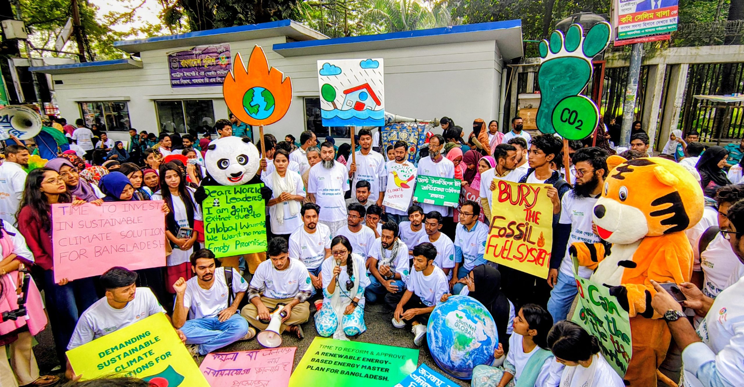 ঢাকা, ২১ নভেম্বর ২০২৫- ব্রাজিলের বেলেম শহরে জাতিসংঘের জলবায়ু সম্মেলন, কপ৩০ চলাকালীন, ঢাকায় শত শত তরুণ, শ্রমিক ও জলবায়ু-ঝুঁকিগ্রস্থ মানুষ শুক্রবার সকালে জাতীয় প্রেসক্লাবের সামনে রাস্তায় নেমে জলবায়ু সুবিচার, বাংলাদেশের জীবাশ্ম জ্বালানিনির্ভর এনার্জি মাস্টারপ্ল্যান (IEPMP) সংশোধন, এবং মানুষ ও পৃথিবীকে সুরক্ষা দেয় এমন দ্রুত, ন্যায়সঙ্গত ও অনুদান-নির্ভর ন্যায্য রূপান্তর বাস্তবায়নের দাবি জানান। তারা জলবায়ু সুবিচার সংহতি দেয়াল, সুন্দরবনের বাঘের ও বিপন্ন পান্ডার পোশাকধারী মাসকট প্রদর্শনীর মতো অভিনব কায়দায় তাদের দাবি তুলে ধরেন।