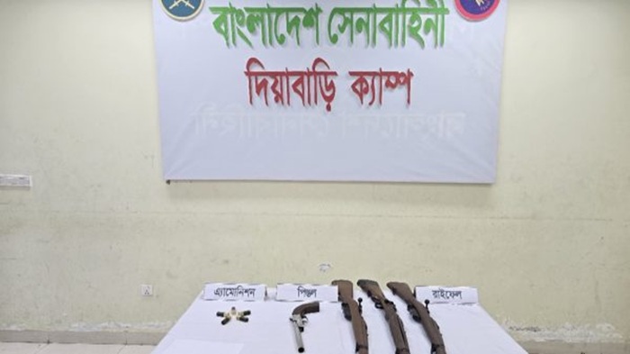 রাজধানীর তুরাগ থানাধীন বেড়িবাঁধ এলাকা হতে সেনা অভিযানে ০৩ টি রাইফেল, ০১টি দেশীয় পিস্তল এবং ০৫ রাউন্ড শর্টগান কার্টিজ উদ্ধার করা হয়েছে।গতরাত আনুমানিক ৩ টায় রাজধানীর তুরাগ থানার বেড়িবাঁধ এলাকায় সেনাবাহিনীর ৬ স্বতন্ত্র এডি ব্রিগেড এর অধীনস্থ দিয়াবাড়িতে অভিযান চালানো হয়। সেনা ক্যাম্প সদস্যরা জানান, সুনির্দিষ্ট গোয়েন্দা তথ্যের ভিত্তিতে সেখানে একটি বিশেষ অভিযান পরিচালনা করা হয়।