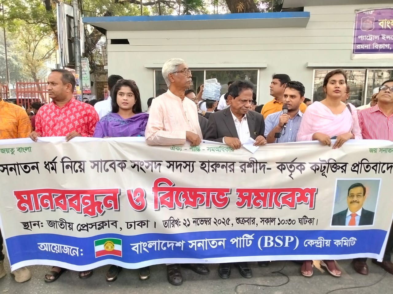 অদ্য ২১/১১/২০২৫ রোজ শুক্রবার জাতীয় প্রেসক্লাব ঢাকায় সম্মুখে সকাল ১০:৩০ ঘটিকায় বাংলাদেশ সনাতন পার্টি (BSP) সহ বিভিন্ন সামাজিক, রাজনৈতিক ও মানবাধিকার সংগঠনের সম্বনয়ে চাপাইনবয়াবগঞ্জ-৩ আসনের সাবেক সংসদ সদস্য হারুনর রশীদ কর্তৃক পূজা একটি শয়তানের ইবাদত মন্তব্যর মধ্যে দিয়ে সনাতন ধর্মীয় অনুভূতিতে আঘাতের প্রতিবাদে বাংলাদেশ জাতীয়তাবাদী দল (বিএনপি) এর দলীয় মনোনয়ন বাতিল ও দল থেকে বহিষ্কারের দাবীতে মানববন্ধন ও বিক্ষোভ সমাবেশর আয়োজন করা হয়েছে। উক্ত মানববন্ধন ও বিক্ষোভ সমাবেশ বাংলাদেশ সনাতন পার্টি (BSP)- এর সভাপতি অনুপ কুমার দত্তের সভাপতিত্বে ও সাধারণ সম্পাদক অ্যাডভোকেট সুমন কুমার রায় এর সঞ্চালনায় আরো উপস্থিত ছিলেন বাংলাদেশ হিন্দু বৌদ্ধ খ্রিস্টান ঐক্য পরিষদের কেন্দ্রীয় কমিটির ভারপ্রাপ্ত সাধারণ সম্পাদক মনিন্দ্র কুমার নাথ, বাংলাদেশ জাতীয় হিন্দু মহাজোট কেন্দ্রীয় কমিটির নির্বাহী মহাসচিব পলাশ কান্তি দে, বাংলাদেশ হিন্দু পরিষদ কেন্দ্রীয় কমিটির সম্মানিত মুখপাত্র সাজন কুমার মিশ্র, বাংলাদেশ হিন্দু বৌদ্ধ খ্রিস্টান যুব ঐক্য পরিষদ-এর সভাপতি শিমুল সাহা, বিশ্ব হিন্দু ফেডারেশনের সভাপতি বরুন সরকার, সন্তোষ দাস, ভক্ত সংঘ সোসাইটির বাংলাদেশ এর সাধারণ সম্পাদক অনীল পাল, বাংলাদেশ জাতীয় হিন্দু মহাসংঘের সভাপতি পিষুস দাস, মানবাধিকার কর্মী সুমা বড়াল, বাংলাদেশ সনাতন পার্টি (BSP) নারায়ণগঞ্জ জেলার সভাপতি টনি দাস, সাধারণ সম্পাদক অবিরাম সূত্রধরসহ, বাংলাদেশ সনাতন পার্টি (BSP)-এর কেন্দ্রীয় কমিটির শ্যামল দাস, অমিত মালী, সবুজ দাস, এস কে সুজীৎ সহ প্রমুখ নেতৃত্ব বৃন্দ উপস্থিত ছিলেন।