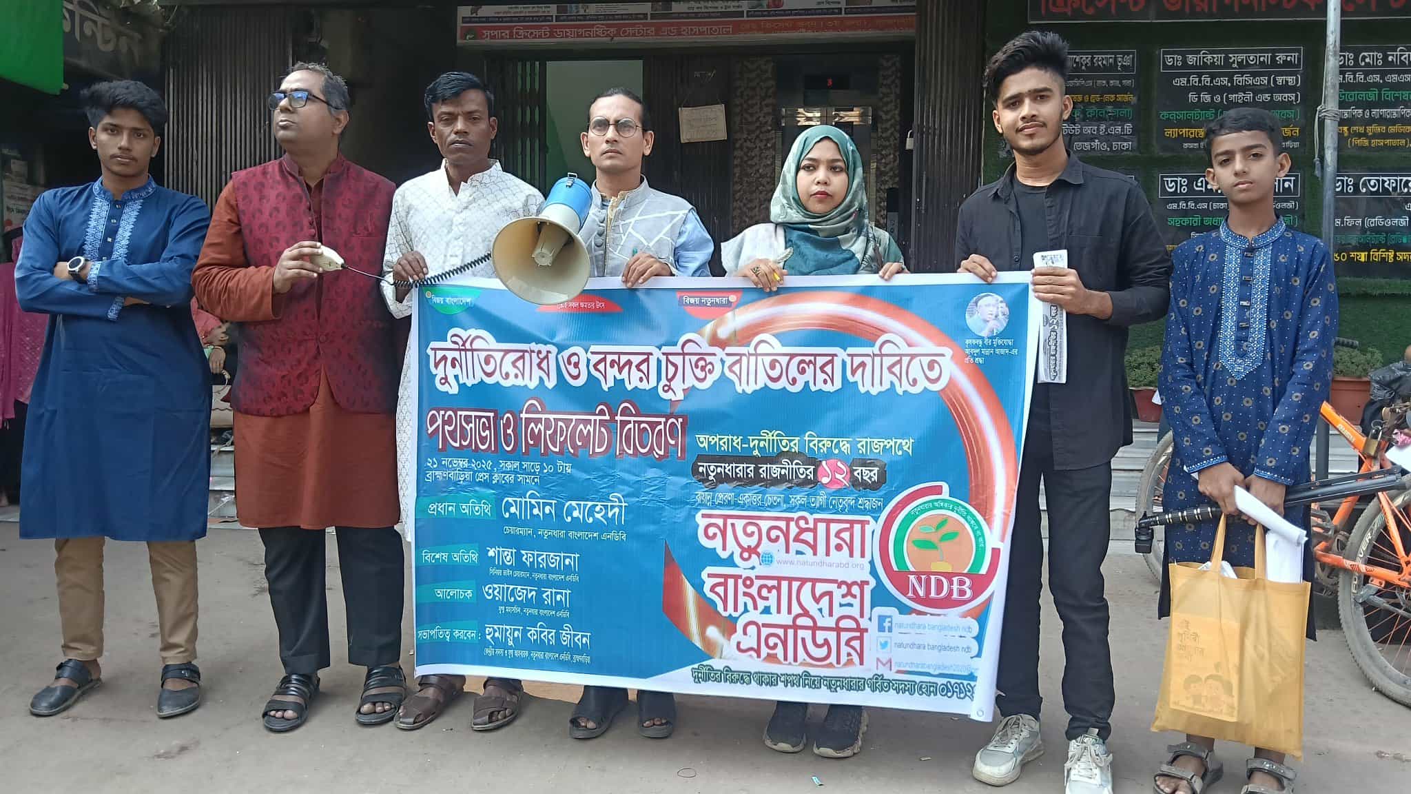 তিনি ২১ নভেম্বর ব্রাহ্মণবাড়িয়া প্রেসক্লাবের সামনে দুর্নীতিরোধ ও বন্দও চুক্তি বাতিলের দাবিতে অনুষ্ঠিত লিফলেট বিতরণ ও পথ সভায় উপরোক্ত কথা বলেন। ব্রাহ্মণবাড়িয়া নতুনধারা বাংলাদেশ এনডিবির যুগ্ম আহবায়ক হুমায়ুন কবির জীবনের সভাপতিত্বে অনুষ্ঠিত কর্মসূচিতে আরো বক্তব্য রাখেন প্রেসিডিয়াম মেম্বার বীর মুক্তিযোদ্ধা ফজলুল হক, সিনিয়র ভাইস চেয়ারম্যান শান্তা ফারজানা, যুগ্ম মহাসচিব ওয়াজেদ রানা প্রমুখ।