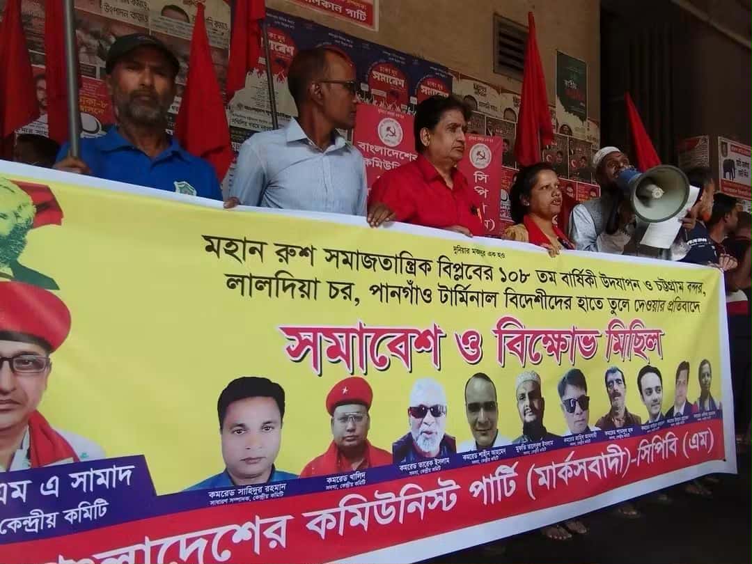 মহান রুশ বিপ্লবের ১০৮ তম বার্ষিকী উদযাপন ও চট্টগ্রাম বন্দর লালদিয়া চর পানগাঁও টার্মিনাল বিদেশিদের হাতে তুলে দেওয়ার প্রতিবাদে আজ শনিবার ২২শে নভেম্বর ২০২৫ জাতীয় প্রেসক্লাবের সামনে দুপুর ২ টায় বাংলাদেশের কমিউনিস্ট পার্টি(মার্কসবাদী)-সিপিবি(এম) এক সমাবেশ ও বিক্ষোভ মিছিল করেছে। সমাবেশে সভাপতিত্ব করেন পার্টির কেন্দ্রীয় কমিটির সভাপতি কমরেড ডাঃ এম এ সামাদ, সমাবেশ সঞ্চালনা করেন কেন্দ্রীয় কমিটির সদস্য কমরেড শাহীন আহমেদ।