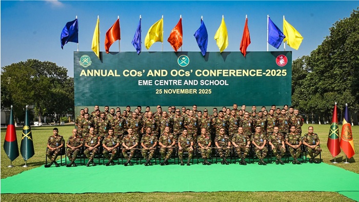 ঢাকা, ২৫ নভেম্বর ২০২৫ (মঙ্গলবার): আজ সৈয়দপুর সেনানিবাসস্থ ইএমই সেন্টার এন্ড স্কুল (ইএমইসিএন্ডএস) এ ইএমই কোরের বাৎসরিক অধিনায়ক সম্মেলন-২০২৫ অনুষ্ঠিত হয়। অনুষ্ঠানে প্রধান অতিথি হিসেবে উপস্থিত ছিলেন সম্মানিত সেনাবাহিনী প্রধান জেনারেল ওয়াকার-উজ-জামান, এসবিপি, ওএসপি, এসজিপি, পিএসসি। সেনাবাহিনী প্রধান ইএমই সেন্টার এন্ড স্কুল এ পৌঁছালে তাকে জিওসি আর্মি ট্রেনিং এন্ড ডকট্রিন কমান্ড; ইএমই কোর এর কর্নেল কমান্ড্যান্ট ও চেয়ারম্যান আরইবি; জিওসি ৬৬ পদাতিক ডিভিশন ও এরিয়া কমান্ডার রংপুর এরিয়া এবং কমান্ড্যান্ট ইএমইসিএন্ডএস অভ্যর্থনা জানান।