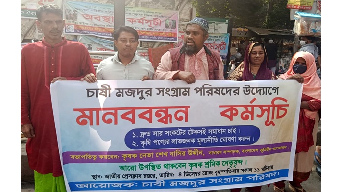 সারা দেশের কৃষকরা সার সংকটে জর্জরিত। এ পরিপ্রেক্ষিতে আজ ৪ ডিসেম্বর ২০২৫ বৃহস্পতিবার সকাল ১১ ঘটিকায় চাষী মজদুর সংগ্রাম পরিষদের উদ্যোগে জাতীয় প্রেসক্লাবের সামনে এক মানববন্ধন কর্মসূচি অনুষ্ঠিত হয়। উক্ত মানববন্ধনে সভাপতিত্ব করেন শেখ নাসির উদ্দিন, সাধারণ সম্পাদক, বাংলাদেশ ভূমিহীন আন্দোলন। আরো বক্তব্য রাখেন- মোঃ মহসিন, দপ্তর সম্পাদক, বাংলাদেশ ভূমিহীন আন্দোলন, মোঃ আরিফুল ইসলাম জুয়েল, সাংগঠনিক সম্পাদক, রাষ্ট্র সংস্কার কৃষক আন্দোলন, মিলি বেগম, সদস্য, বাংলাদেশ ভূমিহীন আন্দোলন। হেনা আক্তার, সদস্য, বাংলাদেশ ভূমিহীন আন্দোলন। উক্ত মানববন্ধনের সঞ্চলনা করেন চাষী মাসুম, আহবায়ক, কৃষক সমিতি।