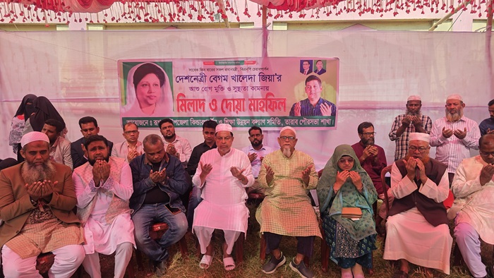 শাকিল আহম্মেদ, স্টাফ রিপোর্টার: নারায়ণগঞ্জের রূপগঞ্জে রূপগঞ্জ উপজেলা কিন্ডারগার্টেন ও শিক্ষা উন্নয়ন কল্যাণ সমিতি তারাব পৌর শাখার উদ্যোগে বেগম খালেদা জিয়ার রোগমুক্তি কামনায় দোয়া মাহফিল অনুষ্ঠিত হয়েছে। শুক্রবার দুপুরে উপজেলার তারাব পৌরসভার হাজী নূর উদ্দিন আহমেদ উচ্চ বিদ্যালয় এ দোয়া মাহফিল অনুষ্ঠিত হয়। এ সময় উপস্থিত ছিলেন, নারায়ণগঞ্জ জেলা বিএনপির সাবেক ভারপ্রাপ্ত আহ্বায়ক নাছির উদ্দীন, রূপগঞ্জ উপজেলা কিন্ডারগার্টেন ও শিক্ষা উন্নয়ন কল্যাণ সমিতির আহ্বায়ক মনিরুল হক ভূইয়া মনির,তারাব পৌর শাখার সভাপতি ডাক্তার হানিফ সাউদ, সাধারণ সম্পাদক এম এ হান্নান সবুজসহ অনেকে।