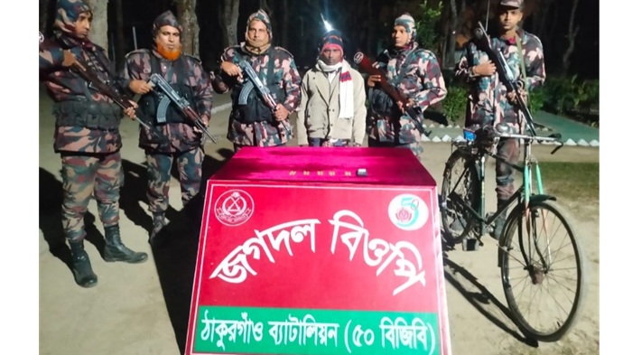 মোঃ আইয়ুব আনছারী, ঠাকুরগাঁও প্রতিনিধি: গত ১১ ডিসেম্বর ২০২৫ তারিখ ২১৪৫ ঘটিকায় নিজস্ব গোয়েন্দা তথ্যের ভিত্তিতে ঠাকুরগাঁও ব্যাটালিয়ন (৫০ বিজিবি) জগদল বিওপি র বিশেষ টহলদল দায়িত্বপূর্ণ এলাকার সীমান্ত পিলার ৩৭৪/৩-আর হতে আনুমানিক ৫০০ গজ বাংলাদেশের অভ্যন্তরে ‘উত্তর কলোনী’ নামক স্থানে অভিযান পরিচালনা করে ০১ জন আসামী মোঃ রহিম বাদশা (৩০), পিতা-মোঃ আতাউর রহমান, গ্রাম-চাকমাপাড়া, পোষ্ট-মুজাহিদাবাদ, থানা-রাণীশংকৈল, জেলা-ঠাকুরগাঁও‘কে ৫০ পিস নেশাজাত ট্যাপেন্টাডল ট্যাবলেট এবং ০১ টি বাইসাইকেল আটক করতে সক্ষম হয় বিজিবি ।