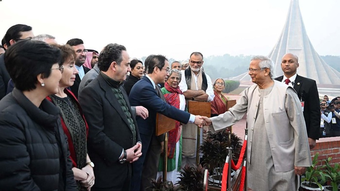 প্রধান উপদেষ্টা প্রফেসর মুহাম্মদ ইউনূস আজ ঢাকায় সাভারে জাতীয় স্মৃতিসৌধে মহান বিজয় দিবস উদ্যাপন উপলক্ষ্যে আগত রাজনৈতিক নেতৃবৃন্দ, উপদেষ্টা পরিষদের সদস্য, কূটনৈতিক ও সরকারি কর্মকর্তাদের সাথে শুভেচ্ছা বিনিময় করেন (মঙ্গলবার, ১৬ ডিসেম্বর ২০২৫)।