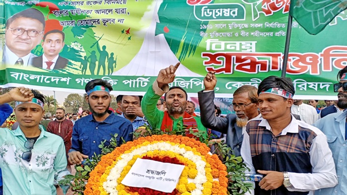 অদ্য মঙ্গলবার (১৬ ডিসেম্বর) সকাল ১০ ঘটিকায় মহান বিজয় দিবসে বাংলাদেশ গণমুক্তি পার্টি'র সভাপতি এম এ আলীম সরকার এর নেতৃত্বে জাতীয় স্মৃতিসৌধে পুষ্পস্তবক অর্পণ করে বীর মুক্তিযোদ্ধা ও শহীদদের প্রতি গভীর শ্রদ্ধা নিবেদন করেন পার্টির নেতাকর্মীরা। শ্রদ্ধা নিবেদন শেষে এক বিবৃতিতে এম এ আলীম সরকার বলেন, আজ মহান বিজয় দিবস। ১৯৭১ সনের ১৬ ডিসেম্বর হানাদার পাকিস্তানি বাহিনী আমাদের মুক্তিযোদ্ধাদের সঙ্গে যুদ্ধে আত্মসমর্পণ করে স্বাধীনতার পথ উন্মুক্ত করে দেয়। তখন থেকে আমাদের জাতি, রাষ্ট্র ও জনগণ স্বাধীনভাবে রাষ্ট্র হিসেবে গড়ে তোলার জন্য চেষ্টা করে আসছে। কিন্তু নানা অশুভ শক্তি আমাদের স্বাধীন বাংলাদেশ গড়ে তোলার প্রচেষ্টাকে ব্যর্থ করার জন্য যথাসম্ভব চেষ্টা করে আসছে। এর ফলে আমাদের স্বাভাবিক অগ্রগতি ব্যাহত হয়েছে। গত ৫৪ বছরের মধ্যে বাংলাদেশ আত্মগঠনের ধারায় এগোতে পারেনি। এই অবস্থার মধ্যে আজ আমাদের ৫৫তম স্বাধীনতা দিবস এসে গিয়েছে। যে বাস্তবতা তৈরি হয়েছে, তাতে করে আমাদের স্বাধীন রাষ্ট্র গড়ে তোলার চেষ্টা চালাতে হবে। আমাদের রাষ্ট্র গঠনের সম্ভাবনা আছে, সে ব্যাপারটা নিয়ে গভীরভাবে অগ্রসর হতে হবে এবং নতুন কর্মপন্থা অবলম্বন করতে হবে। সেই নতুন লক্ষ্যে অগ্রসর হতে হলে আমাদের চিন্তা-ভাবনা এবং কাজের ধরন বদলাতে হবে। উদ্দেশ্য নির্ণয়, সেই নতুন উদ্দেশ্য নিয়ে আমাদের নতুন সংগ্রাম আরম্ভ করতে হবে। রাজনীতির দিক দিয়ে বিচার করলে দেখা যাবে পৃথিবীর সব রাষ্ট্রই আজ ভুল পথ ধরে চলছে । এই ধারায় স্বল্প সময়ের মধ্যে সুষ্ঠু ধারায় উত্তীর্ণ হওয়া যাবে না। তাই স্বাধীনতা দিবসে আমাদের উল্লোসিত হওয়ার কোনো কারণ নাই। এখন আমাদের দরকার আত্মজিজ্ঞাসা, আত্মসমালোচনা এবং নতুন ধারা সংগ্রামের জন্য কর্মসূচি ও কর্মনীতি অবলম্বন করতে হবে। এখন আমাদের গতানুগতিক পথে না চলে আত্মগঠনে এবং আত্মউন্নয়নের জন্য নতুন লক্ষ্য নির্ধারণ করা ও কর্মসূচি অবলম্বন করা দরকার। আমাদের আত্মসমালোচনা, আত্মশুদ্ধি ও নতুন কর্মসূচি অবলম্বন করে এগোতে হবে। আমাদেরকে অবলম্বন করতে হবে জনসাধারণকে উদ্বুদ্ধ করার ও পরিচালনা করার নীতি। আমরা সংঘাত-সংঘর্ষ চাই না। বিবেক ও যুক্তি অবলম্বন করে নতুন কর্মসূচি ও কর্মনীতি অবলম্বন করতে হবে। লক্ষ্য ও কর্মপন্থা নির্ণয় করে কাজ করতে হবে। আমরা জনসাধারণকে জাগিয়ে তুলব এবং জনসাধারণের মন মানসিকতা বিবেচনা করে কাজ করতে হবে। বিপুল সম্ভাবনা আছে, সেই সম্ভাবনা কাজে লাগানোই আমাদের দায়িত্ব। বাংলাদেশের রাষ্ট্রব্যবস্থায় ও চলমান বিশ্বব্যবস্থায় আমাদের করণীয় নির্ধারণ করে পরিচ্ছন্ন মত প্রকাশ করতে হবে। বাংলাদেশ থেকে আমরা যে চিন্তা ও কর্মপন্থা ঘোষণা করব, তা পৃথিবীর সকল রাষ্ট্রের জনগনই গ্