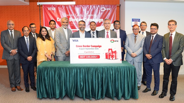ডিজিটাল পেমেন্টের বিশ্বব্যাপী সমাদৃত জনপ্রিয় গেটওয়ে, ভিসা (VISA) এবং আইএফআইসি ব্যাংক এর যৌথ উদ্যোগে আয়োজিত ‘ক্রস-বর্ডার ক্যাম্পেইন’ (আগস্ট–সেপ্টেম্বর ২০২৫)-এ সর্বোচ্চ লেনদেনকারীকে পুরস্কৃত করেছে আইএফআইসি ব্যাংক। রবিবার (২১ ডিসেম্বর, ২০২৫)ব্যাংকের প্রধান কার্যালয়ে আয়োজিত এক অনুষ্ঠানে ক্যাম্পেইনের বিজয়ী - আইএফআইসি ব্যাংকের গ্রাহক জনাব শাহরিয়ার আহমেদ (ব্যবস্থাপনা পরিচালক, ইসলাম গার্মেন্টস লিমিটেড) কে পুরষ্কার প্রদান করা হয়। এ সময় তার হাতে এক লক্ষ টাকার গিফট ভাউচার তুলে দেন আইএফআইসি ব্যাংকের ব্যবস্থাপনা পরিচালক জনাব সৈয়দ মনসুর মোস্তফা এবং ভিসার কান্ট্রি ম্যানেজার (বাংলাদেশ, নেপাল ও ভুটান)জনাব সাব্বির আহমেদ। অনুষ্ঠানে আইএফআইসি ব্যাংকের উপ-ব্যবস্থাপনা পরিচালকবৃন্দসহ উভয় প্রতিষ্ঠানের ঊর্ধ্বতন কর্মকর্তাবৃন্দ উপস্থিত ছিলেন।