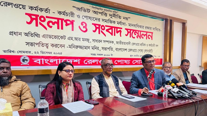 সংবাদ সম্মেলনে লিখিত বক্তব্যে বাংলাদেশ রেলওয়ে পোষ্য সোসাইটির সভাপতি মোঃ মনিরুজ্জামান মনির বলেন, বাংলাদেশ একটি সাংবিধানিক গণতান্ত্রিক রাষ্ট্র। এই রাষ্ট্রব্যবস্থার মূল ভিত্তি হলো আইনের শাসন, ন্যায়বিচার, জবাবদিহিতা ও মানবিক মর্যাদা। এই কাঠামোর ভেতরেই বাংলাদেশ রেলওয়ে একটি বিশেষায়িত কারিগরি ও প্রশাসনিক প্রতিষ্ঠান হিসেবে রাষ্ট্রের অর্থনীতি, যোগাযোগ ও জাতীয় নিরাপত্তায় গুরুত্বপূর্ণ ভূমিকা পালন করে আসছে। সরকারি কার্যক্রমের স্বচ্ছতা নিশ্চিত করার জন্য অডিট বা নিরীক্ষা ব্যবস্থা রাষ্ট্রীয় প্রশাসনের একটি অবিচ্ছেদ্য অংশ। অডিটের উদ্দেশ্য কখনোই কাউকে অপরাধী বানানো নয়; বরং এটি একটি প্রতিরোধমূলক ও নিয়ন্ত্রণমূলক প্রশাসনিক প্রক্রিয়া। কিন্তু বর্তমান বাস্তবতায় আমরা গভীর উদ্বেগের সঙ্গে লক্ষ্য করছি— * অডিট আপত্তি উঠলেই সংশ্লিষ্ট কর্মকর্তা-কর্মচারীকে ‘দুর্নীতিবাজ’, ‘লুটপাটকারী’ হিসেবে উপস্থাপন করা হচ্ছে, *কোনো তদন্ত, চার্জশিট বা আদালতের রায় ছাড়াই গণমাধ্যম ও সামাজিক মাধ্যমে চরিত্রহনন করা হচ্ছে, * এর সরাসরি শিকার হচ্ছেন তাদের পরিবার, সন্তান ও পোষ্যরা—যারা সামাজিক নিগ্রহ, মানসিক চাপ ও সম্মানহানির মধ্যে পড়ছেন। এটি কেবল প্রশাসনিক অনিয়ম নয় * এটি সংবিধান লঙ্ঘন, * মানবাধিকার লঙ্ঘন, এবং ন্যায়বিচারের মৌলিক নীতির পরিপন্থী।