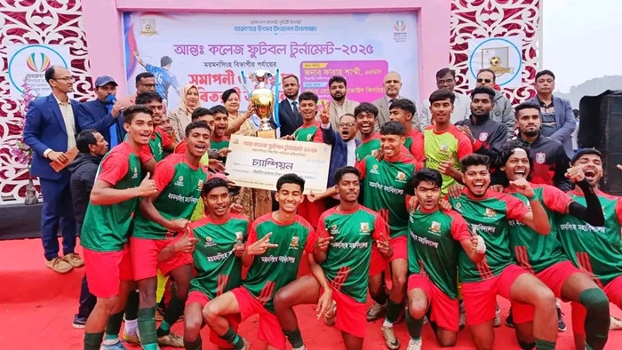 মকবুল হোসেন, ময়মনসিংহ জেলা প্রতিনিধি: তারুণ্যের উৎসব উদযাপন উপলক্ষ্যে ময়মনসিংহ বিভাগীয় পর্যায়ে আন্তঃকলেজ ফুটবল টুর্নামেন্ট ২০২৫ প্রতিযোগিতায় ময়মনসিংহ জেলার খেলোয়াড়রা সেরা হয়েছেন। জামালপুর জেলার বকশীগঞ্জ সরকারি কিয়ামত উল্লাহ কলেজের খেলোয়াড়দের বিপরীতে ৪-১গোলে বিজয়ী হন ময়মনসিংহ মহাবিদ্যালয়ের খেলোয়াড়রা।