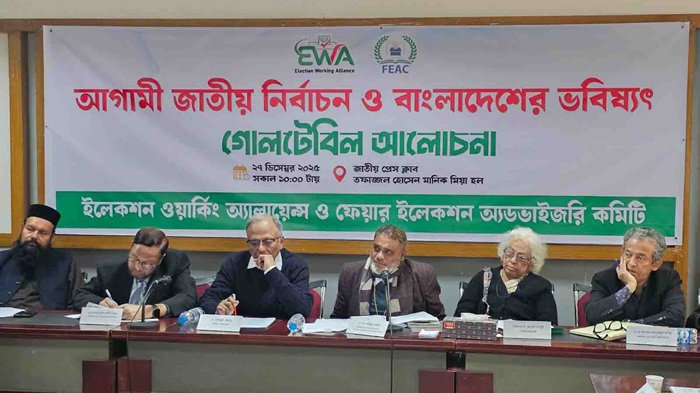 আজ শনিবার (২৭ ডিসেম্বর) সকাল ১০ ঘটিকায় জাতীয় প্রেস ক্লাবের তফাজ্জল হোসেন মানিক মিয়া মিলনায়তনে ইলেকশন ওয়ার্কিং অ্যালায়েন্স এবং ফেয়ার ইলেকশন অ্যাডভাইজরি কমিটির যৌথ উদ্যোগে ‘আগামী জাতীয় নির্বাচন ও বাংলাদেশের ভবিষ্যৎ’ শীর্ষক এক গোলটেবিল আলোচনা সভা অনুষ্ঠিত হয়। সভায় বক্তারা বলেন, আগামী জাতীয় সংসদ নির্বাচন অবাধ, স্বচ্ছ ও সুষ্ঠুভাবে অনুষ্ঠিত হওয়ার ওপর দেশের টেকসই গণতন্ত্র, সুশাসন ও উন্নয়নের ভবিষ্যৎ গভীরভাবে নির্ভরশীল। এ জন্য আসন্ন ত্রয়োদশ জাতীয় সংসদ নির্বাচন দেশ-জাতির জন্য খুবই গুরুত্বপূর্ণ। দেশের স্বাধীনতা-সার্বভৌমত্ব অক্ষুণ্ণ রাখা এবং আধিপত্যবাদের বিরুদ্ধে একটি দেশপ্রেমিক গণতান্ত্রিক সরকার গঠনের জন্যও আগামী নির্বাচন গুরুত্বপূর্ণ।